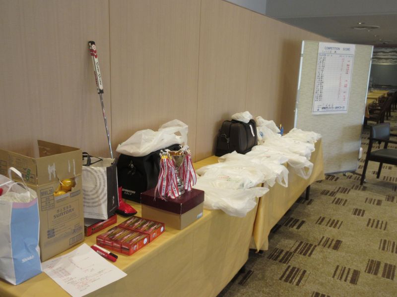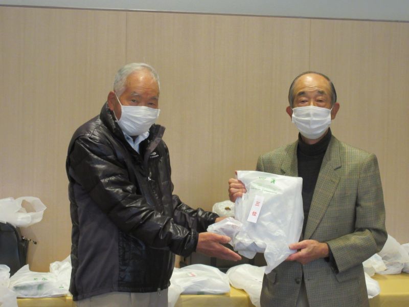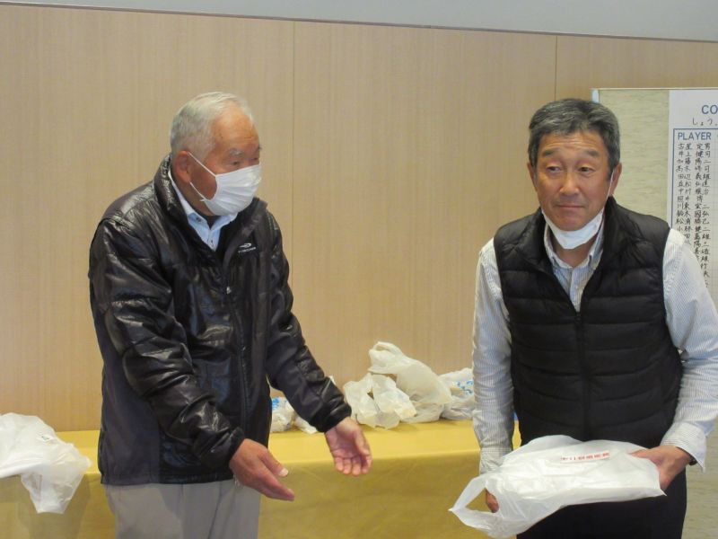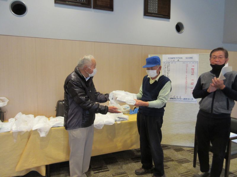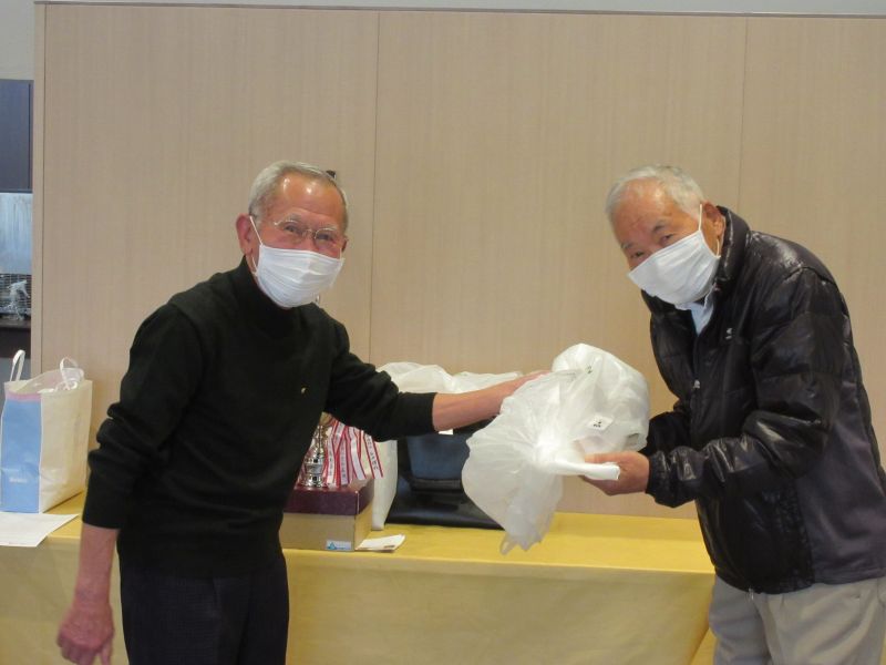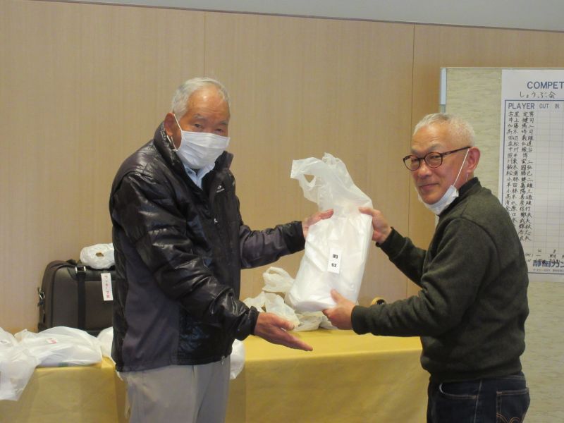 表彰式で並松会長から、今年も楽しく笑顔で開催できたことに感謝するとともに来年も協力を!と、呼びかけた。続けて表彰に移り 初参加の照井さんは残念ながらしょうぶ会ルールに基づき繰り下げ4位となり、優勝は小数点の僅差で高木(善)さんがカップを受け、準優勝に高木(修)さん、3位:中村さんがそれぞれカニを持ち帰った。ゴルフ場提供のボストンバッグ2個はラッキーセブンの石井さんとBB賞の播口さんがゲット、他 当月賞や当日賞、飛び賞、参加賞にも豪華賞品?を持ち帰った。