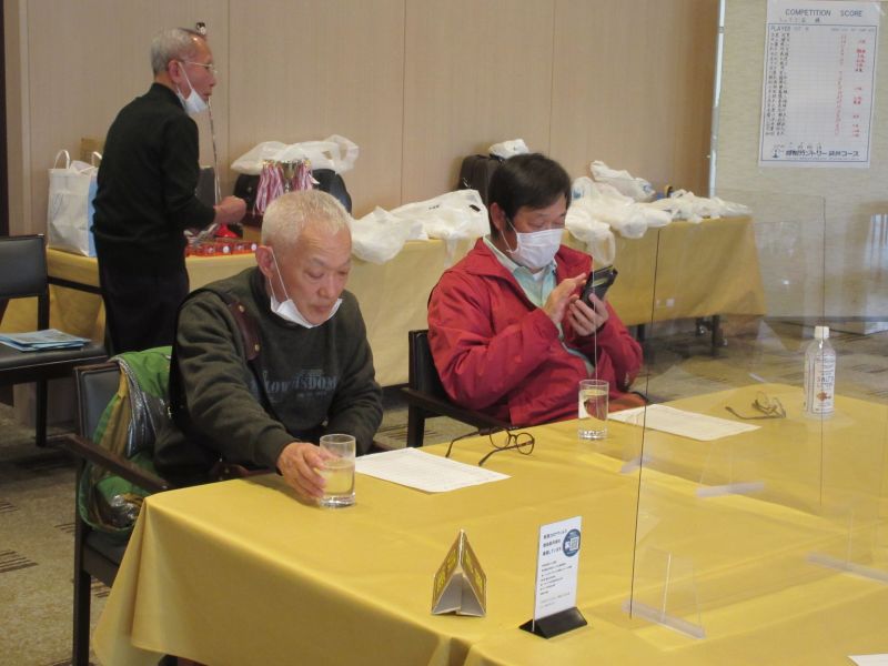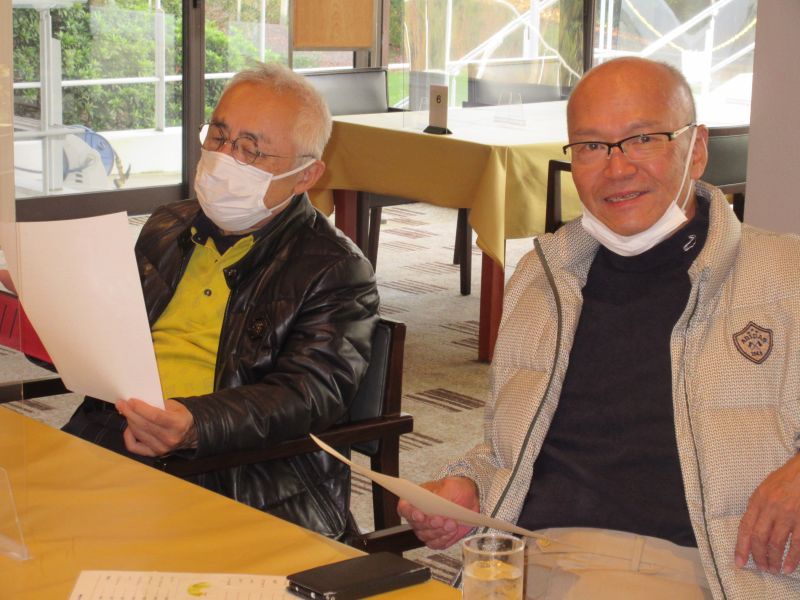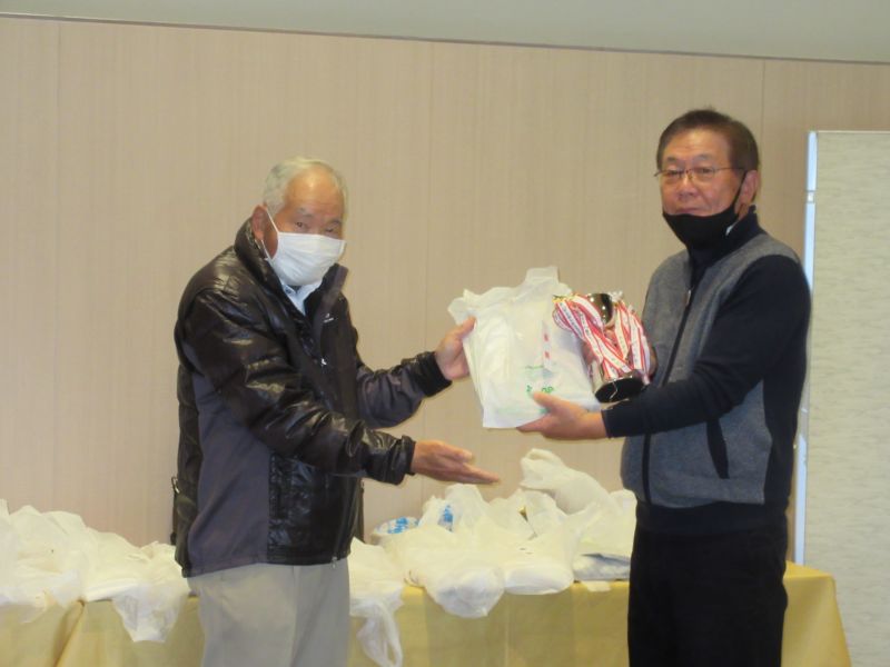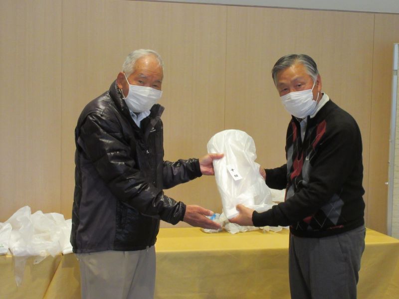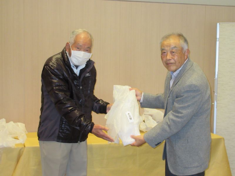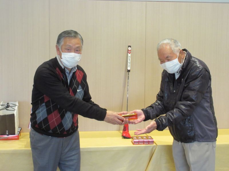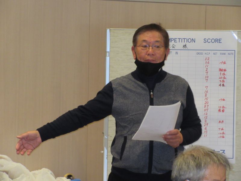 表彰式で並松会長から、今年も楽しく笑顔で開催できたことに感謝するとともに来年も協力を!と、呼びかけた。続けて表彰に移り 初参加の照井さんは残念ながらしょうぶ会ルールに基づき繰り下げ4位となり、優勝は小数点の僅差で高木(善)さんがカップを受け、準優勝に高木(修)さん、3位:中村さんがそれぞれカニを持ち帰った。ゴルフ場提供のボストンバッグ2個はラッキーセブンの石井さんとBB賞の播口さんがゲット、他 当月賞や当日賞、飛び賞、参加賞にも豪華賞品?を持ち帰った。