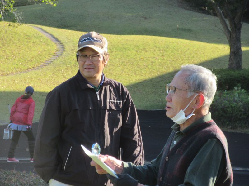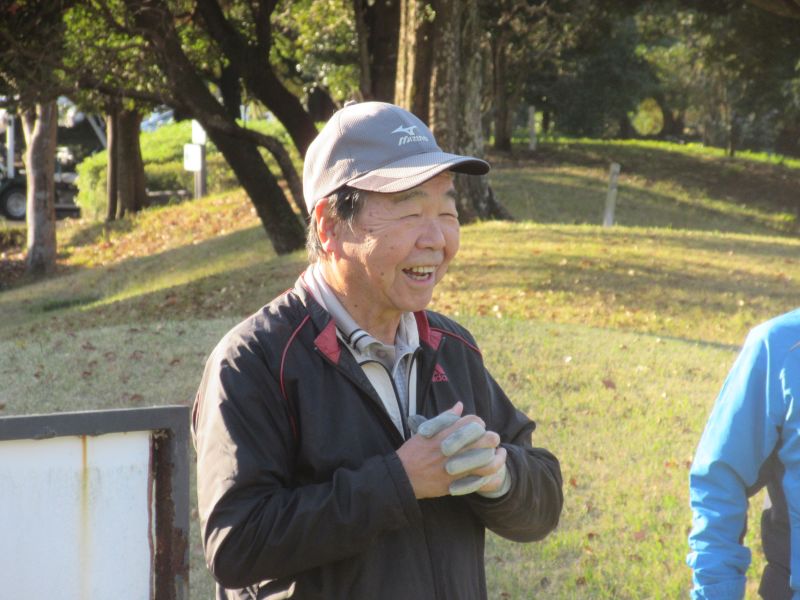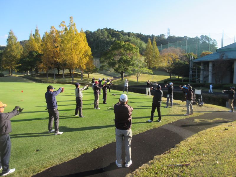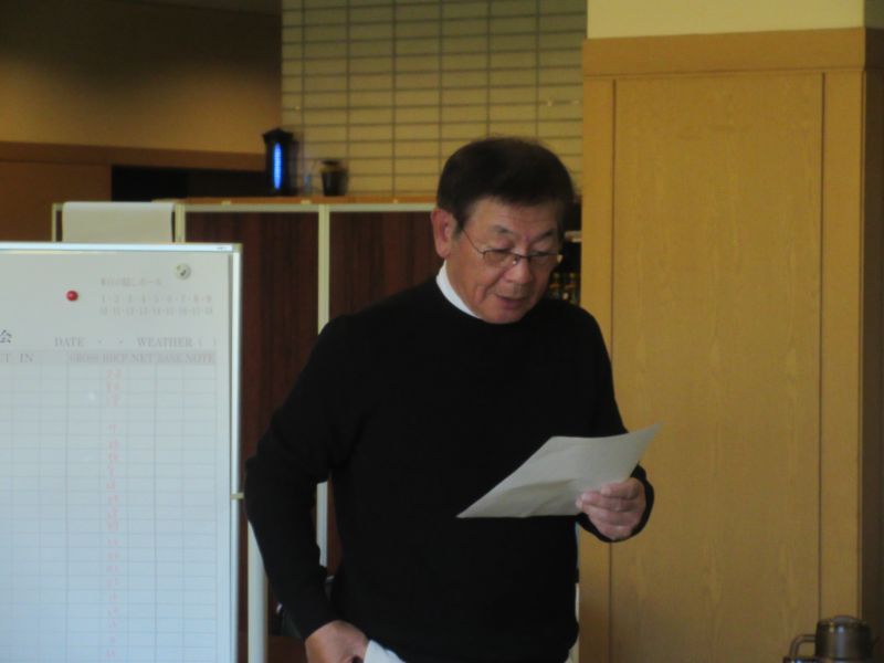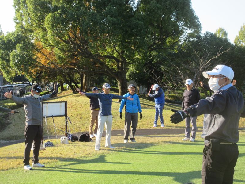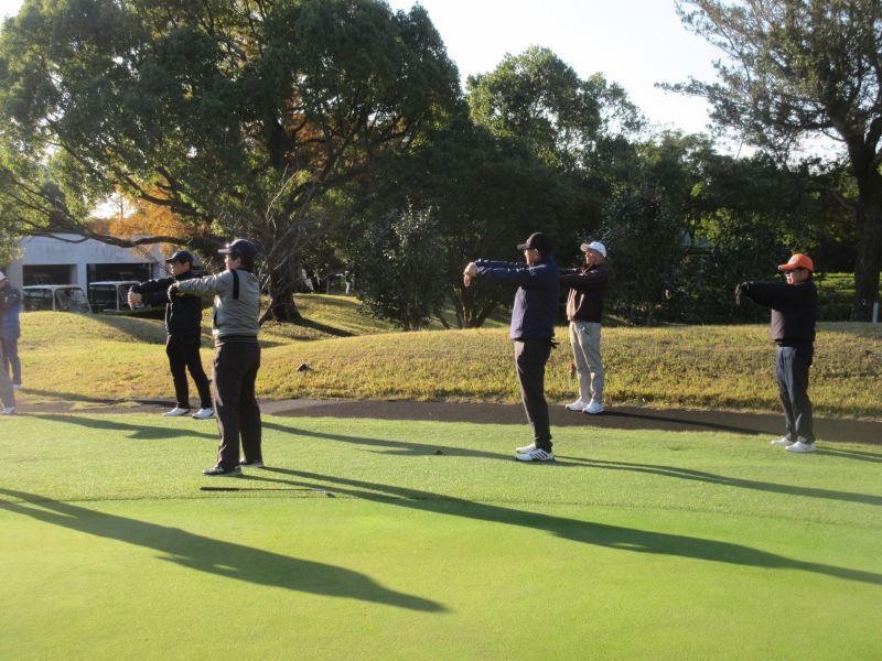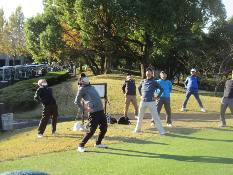 まず、古屋会長「今日は節目のコンペ お互いにプレーを楽しみましょう!」と。挨拶の後、播口幹事から本日の賞などを披露し、寺澤さんによるストレッチ体操を入念に行った。