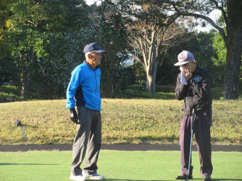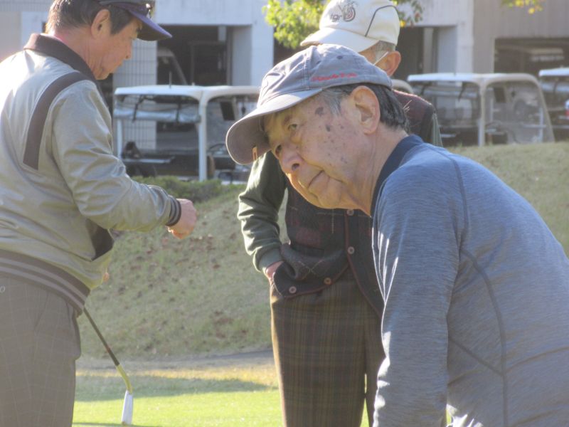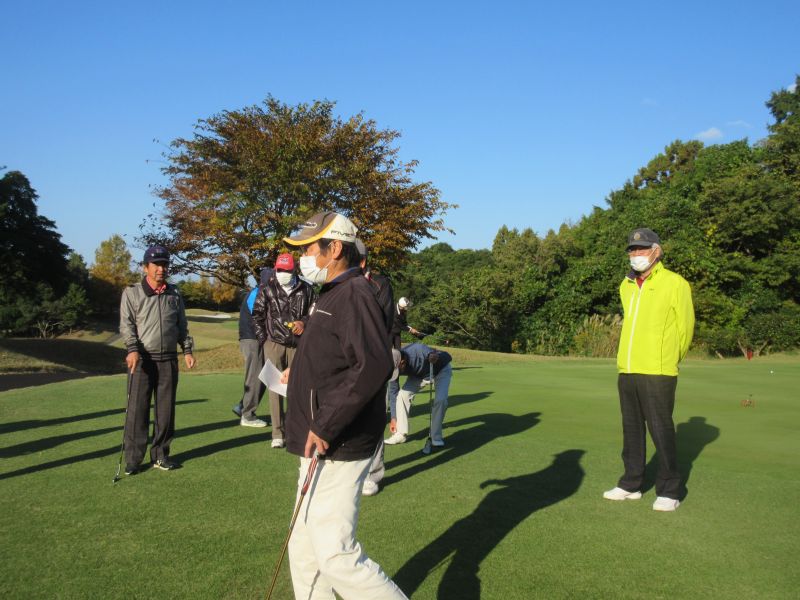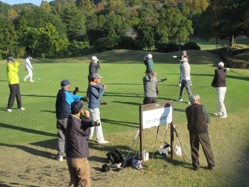 当日は、天候に恵まれ防寒着を羽織った参加者は思い思いにパター練習に余念がない。