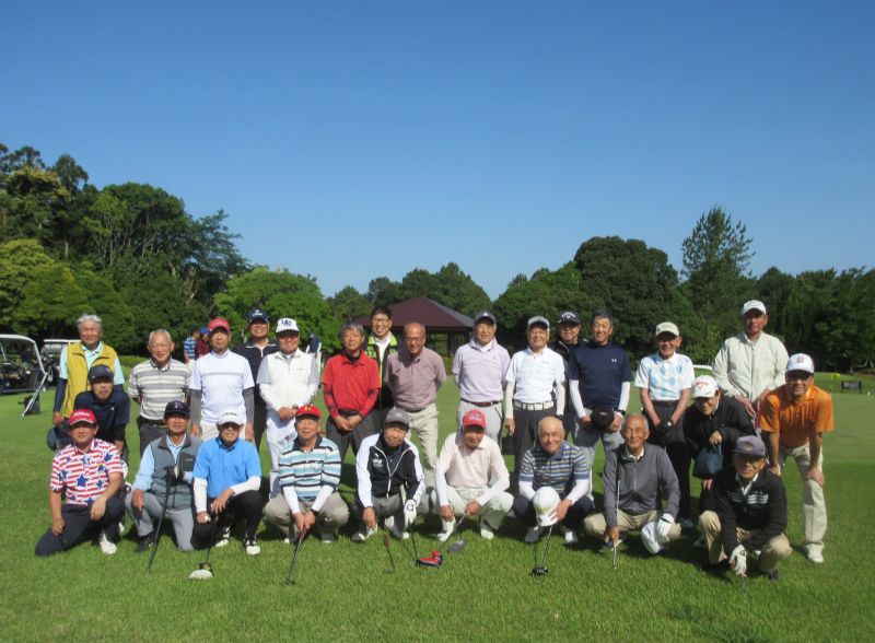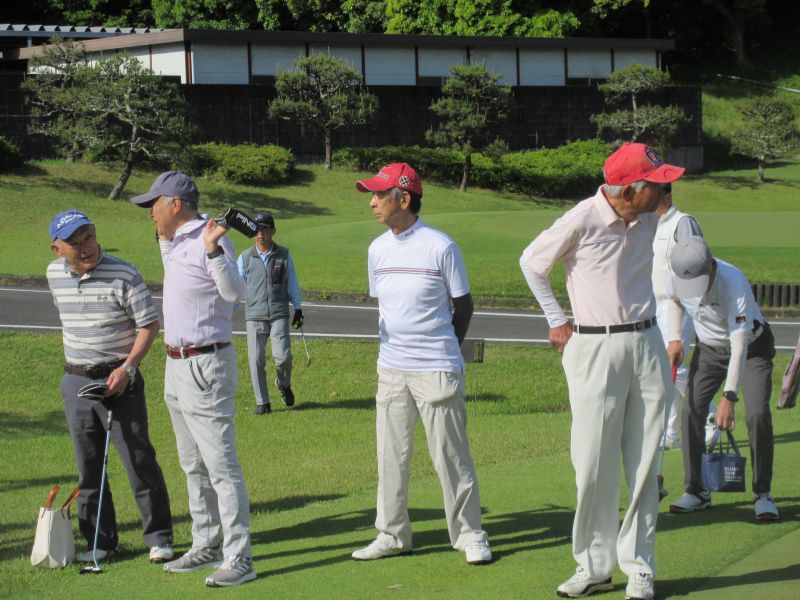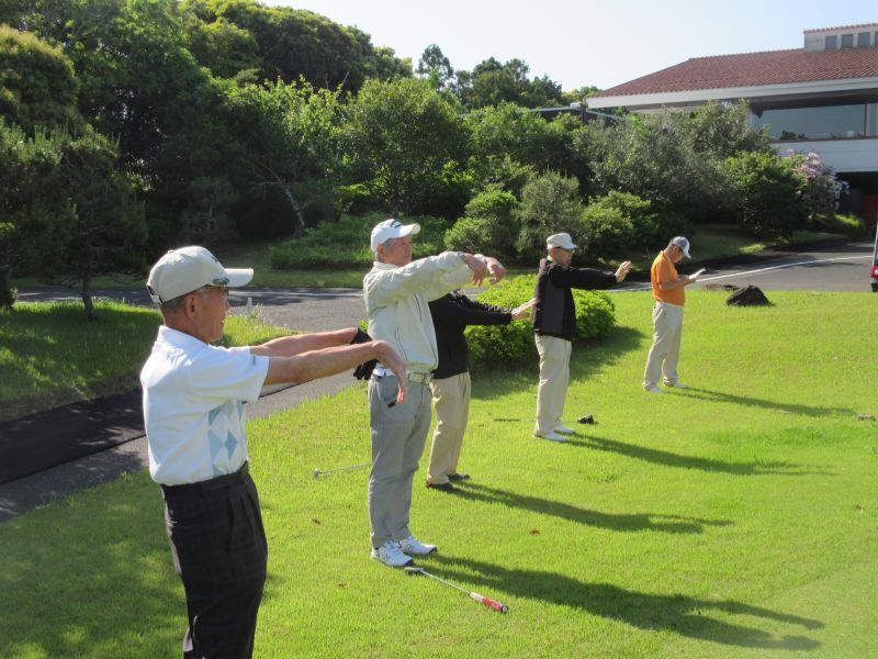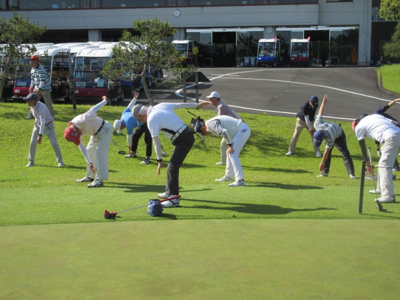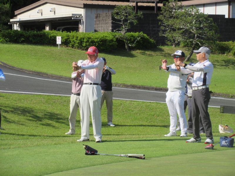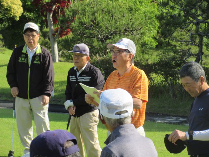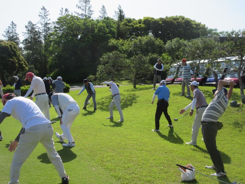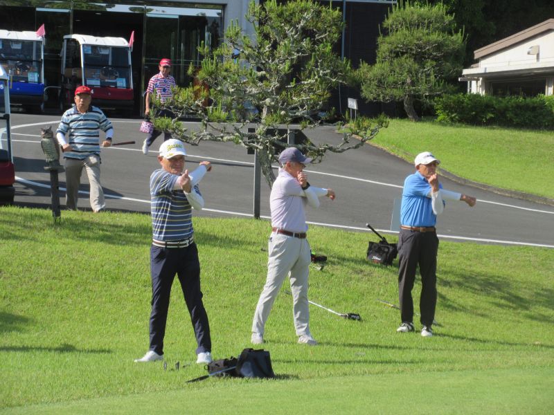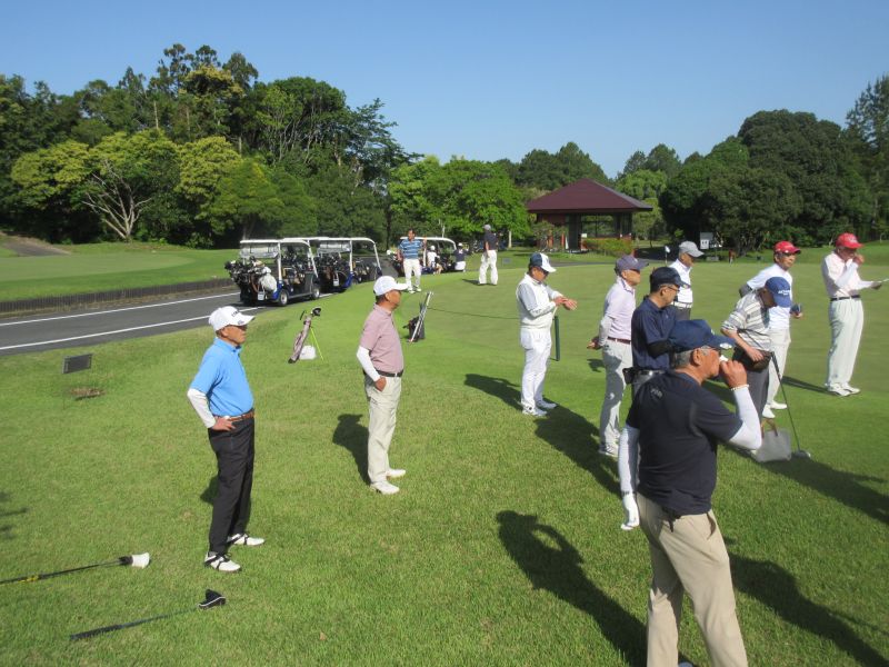 幹事田辺さんの集合合図で まず、古屋会長から「皆でゴルフを楽しみましょう」との挨拶、幹事から本日の各賞を披露、寺澤さんのリードでストレッチ体操を行い、集合写真を撮影後、OUT/INに別れて緑あざやかなフェアウェイに白球を打ち込んでいった。