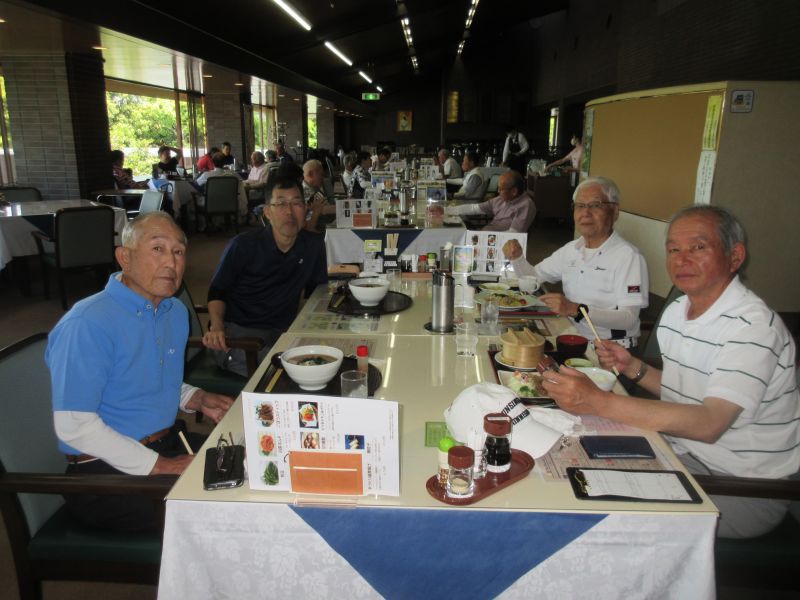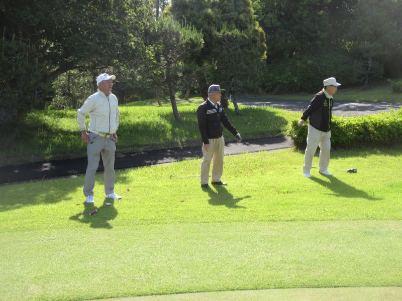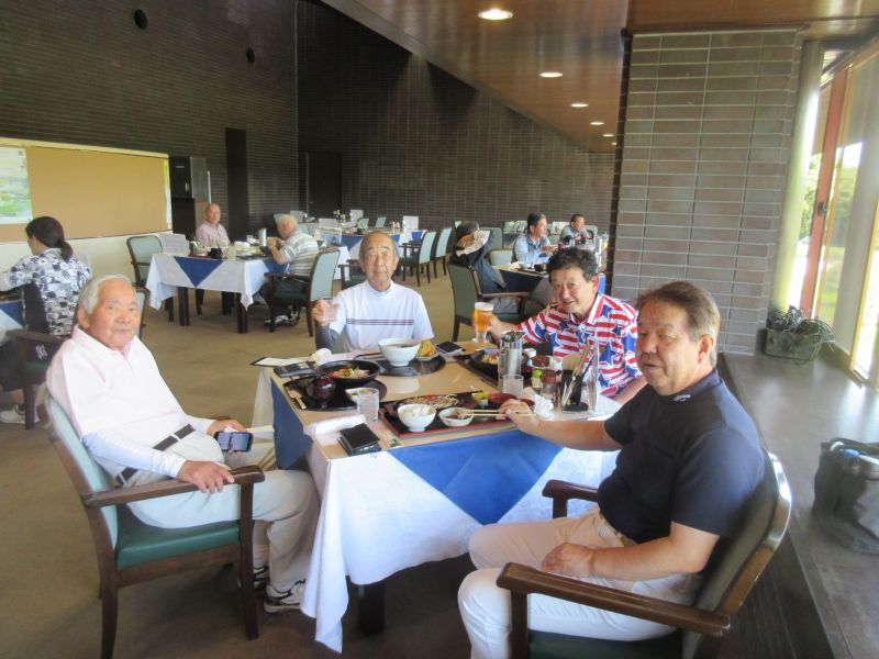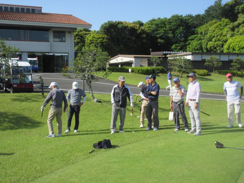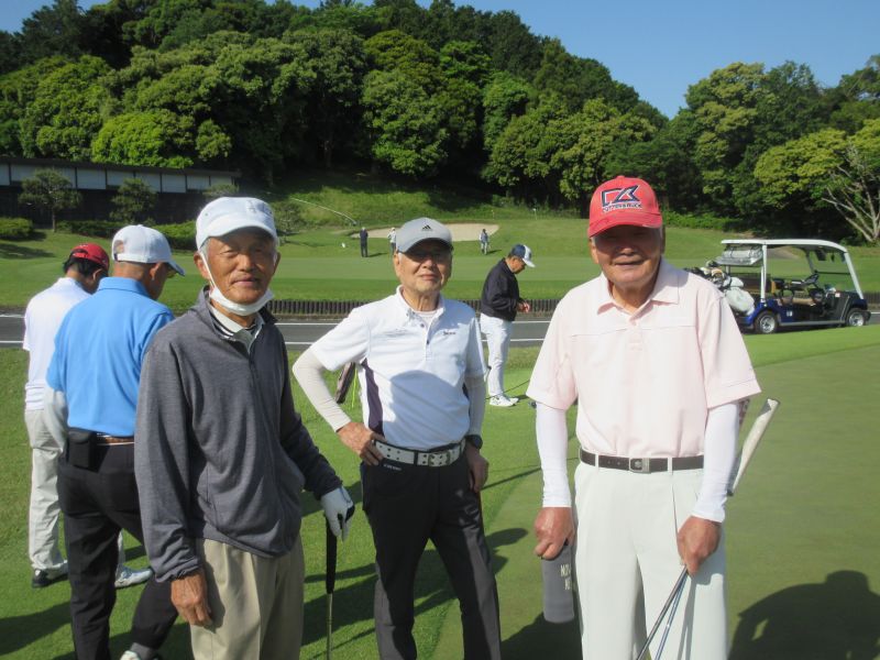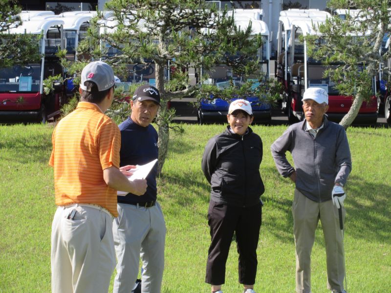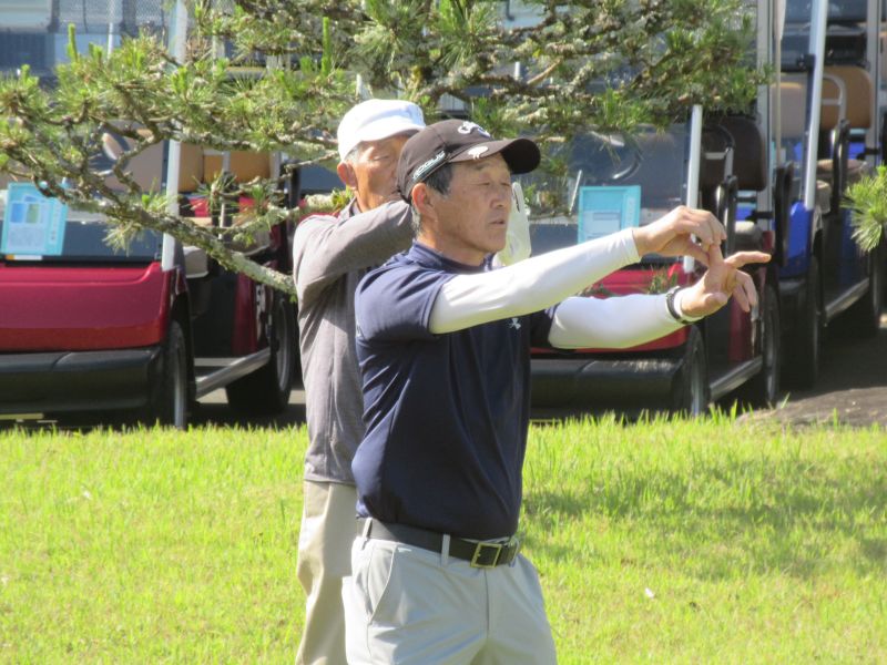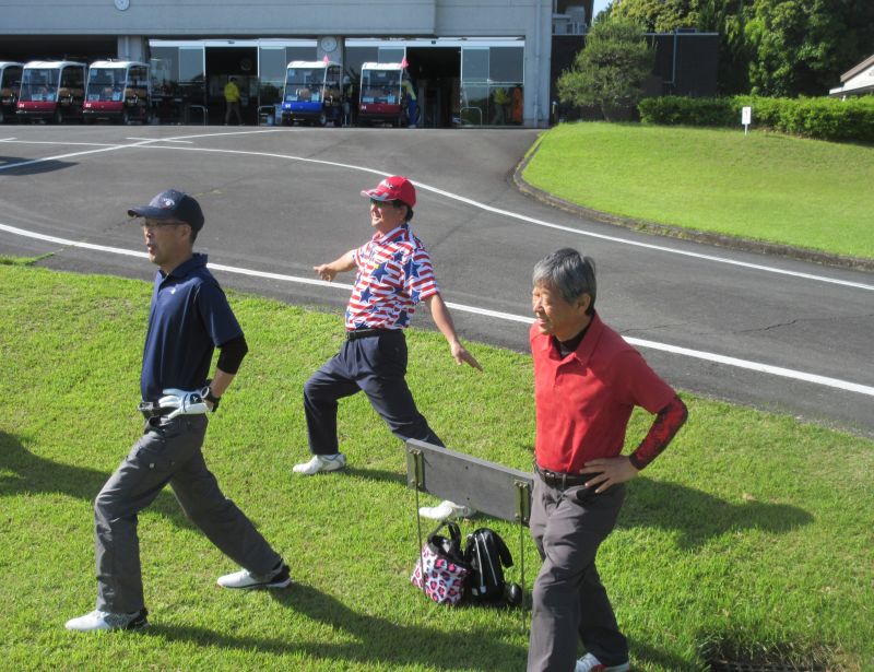 幹事田辺さんの集合合図で まず、古屋会長から「皆でゴルフを楽しみましょう」との挨拶、幹事から本日の各賞を披露、寺澤さんのリードでストレッチ体操を行い、集合写真を撮影後、OUT/INに別れて緑あざやかなフェアウェイに白球を打ち込んでいった。
