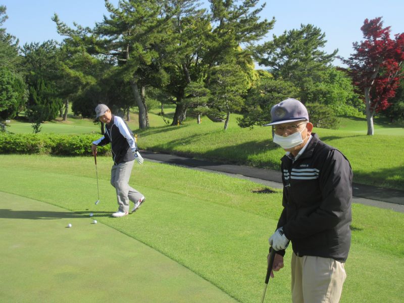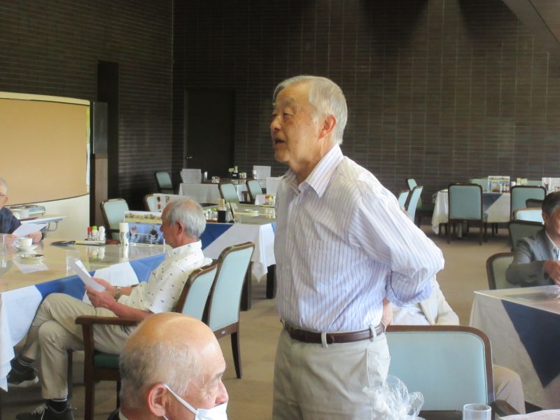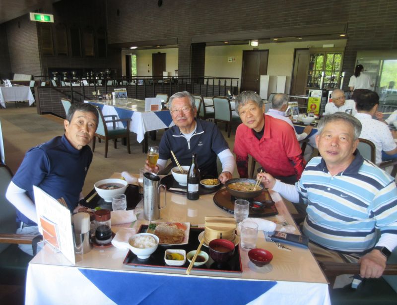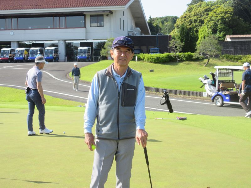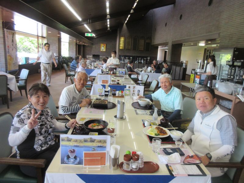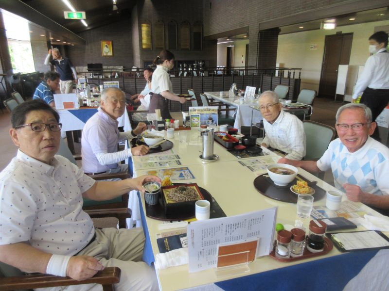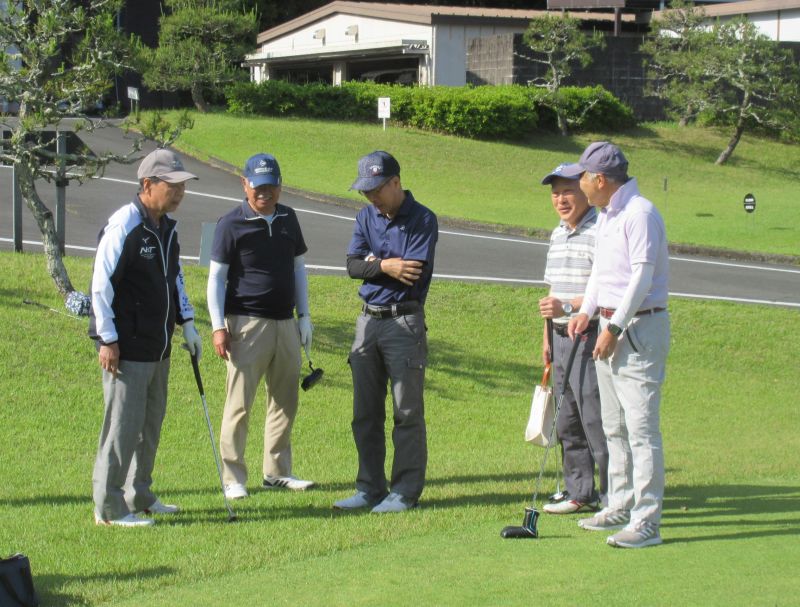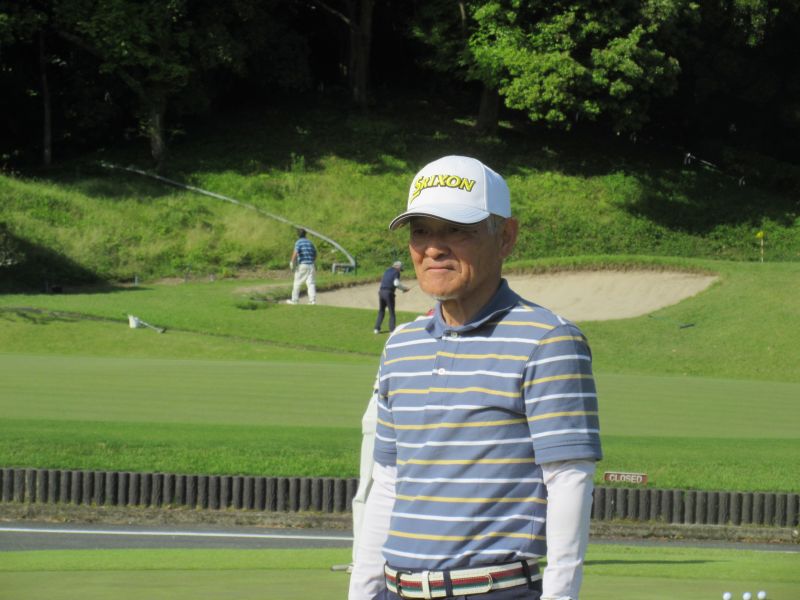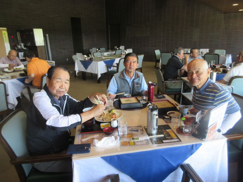 幹事田辺さんの集合合図で まず、古屋会長から「皆でゴルフを楽しみましょう」との挨拶、幹事から本日の各賞を披露、寺澤さんのリードでストレッチ体操を行い、集合写真を撮影後、OUT/INに別れて緑あざやかなフェアウェイに白球を打ち込んでいった。