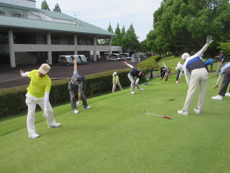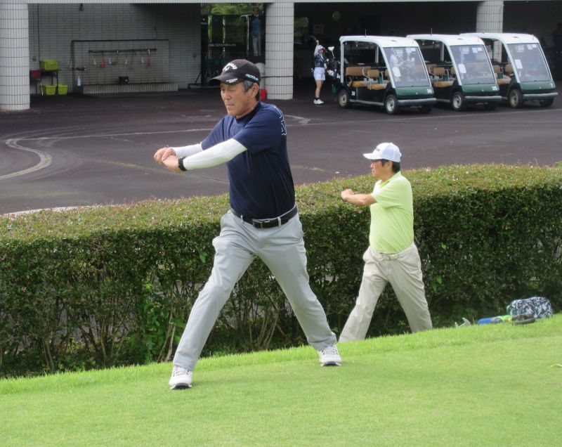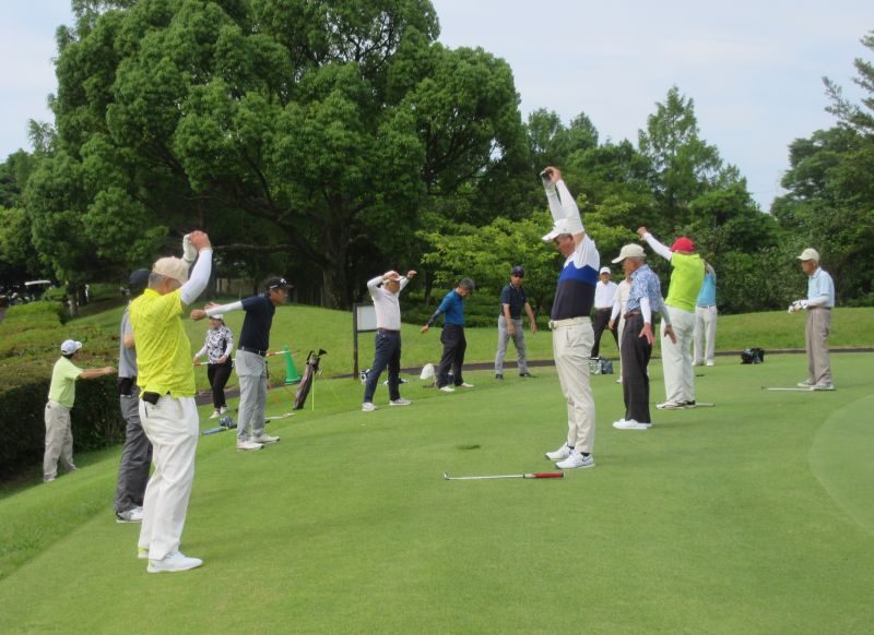 まず、田辺幹事から組み合わせの一部変更や本日の賞などを説明後、寺澤さんの指導でストレッチ体操を行い、全員でカメラに収まったのちOUT/INに分れてスタートして行った。