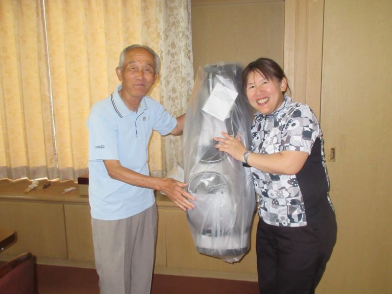 ゴルフ場提供のラッキーセブン賞(キャディバッグ)をニアピン賞2つと共に石川さんが笑顔で持ち帰った。