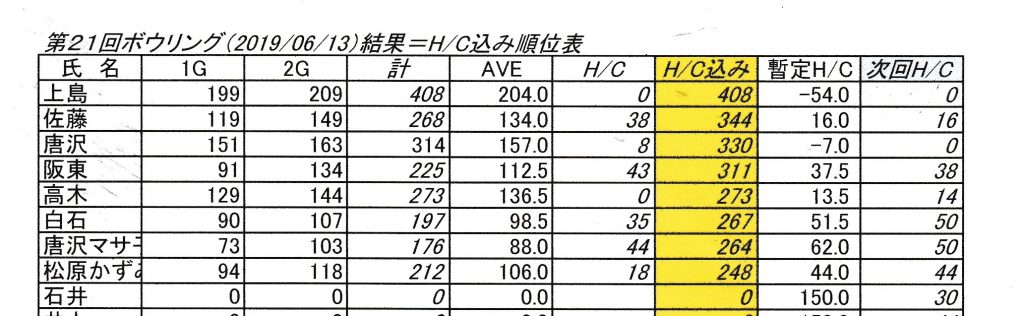 実施日:2019年6月13日(木) 場所:袋井グランドボウル 会費:500円(別途靴代300円) 参加者:8名(上島さん、佐藤さん、唐澤さん、阪東さん、高木さん、白石さん、唐澤マさん、松原和さん)