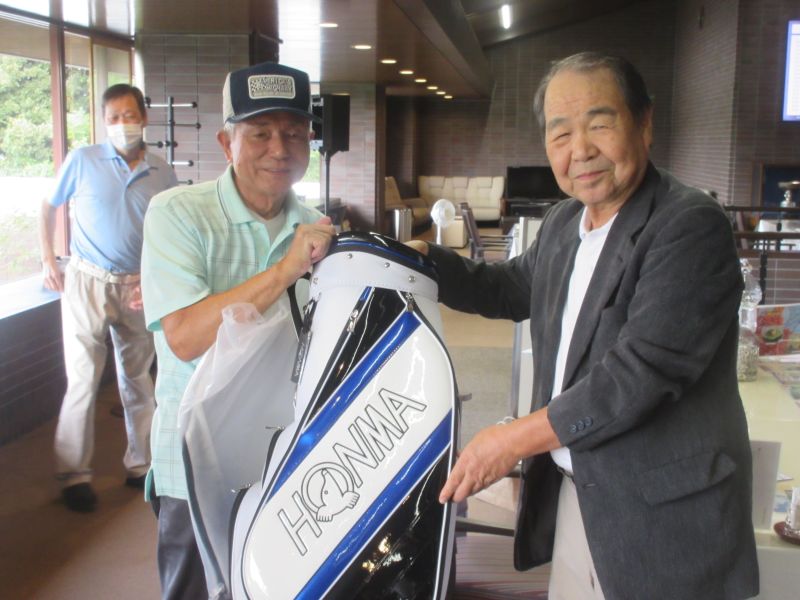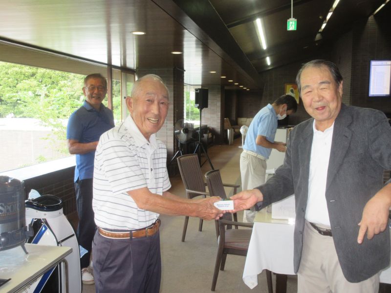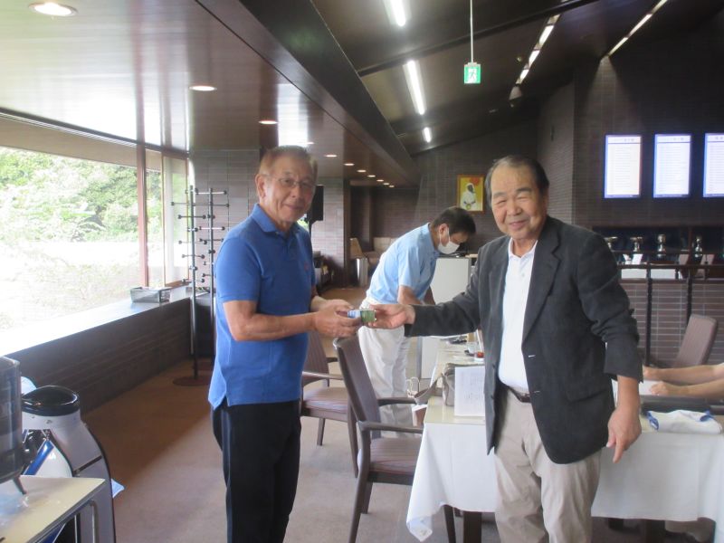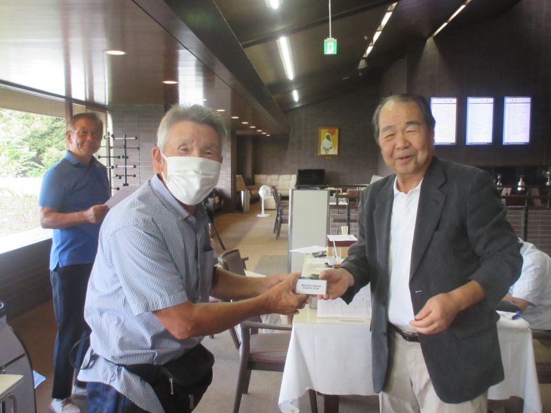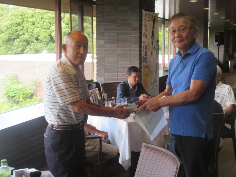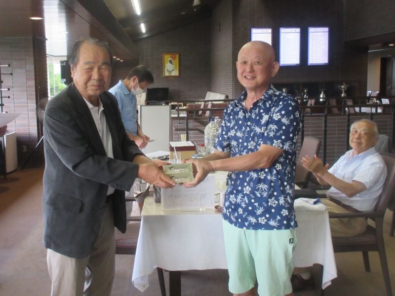 幹事より、山崎さんの3回目のエイジシュート(グロス80/82歳)の達成に対し、記念品贈呈を行った。