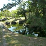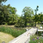 ◆ 下屋敷庭園跡 江戸時代後期の田中城絵図によると、下屋敷には築山や泉水、茶屋や稲荷社がありました。築山は四季を通じて景色よく、泉水には多くのカキツバタが映えていたと云われます。しかし、明治・対象・昭和と時代が移るにつれて下屋敷の姿も変わりました。南側にあった築山は平にされ、泉水も埋められて畑となりました。ららに、六間川の改修によって下屋敷跡は昔の半分程度の広さになりました。