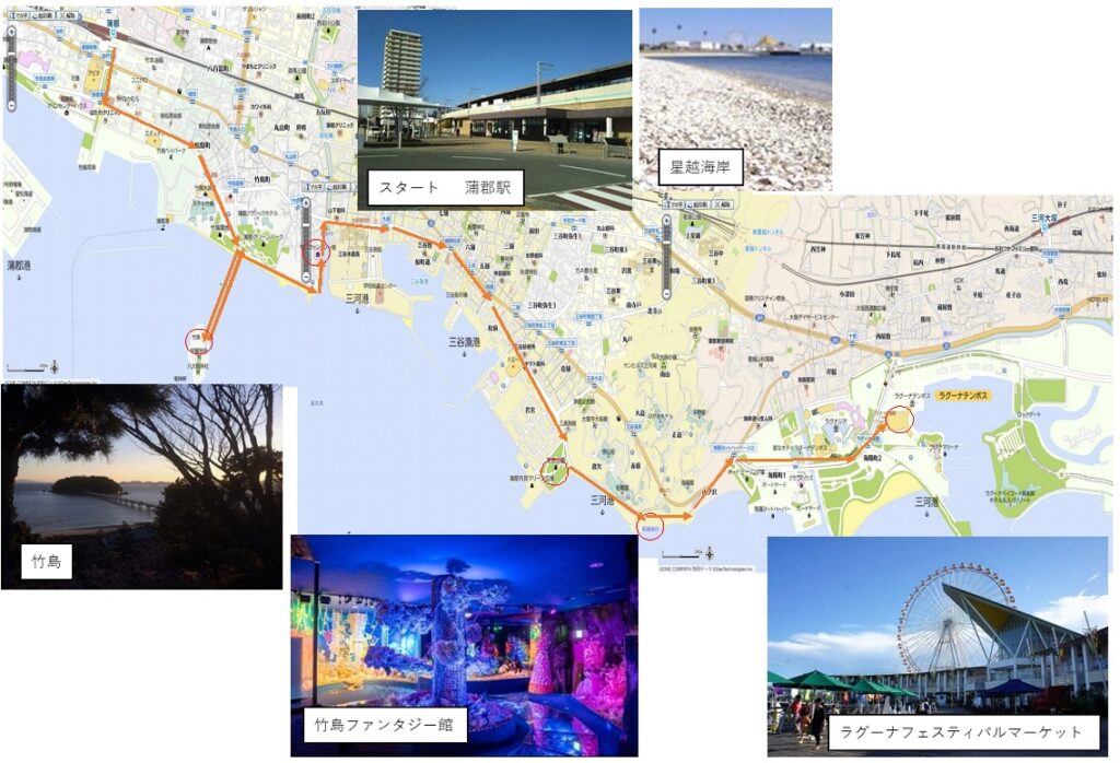 蒲郡駅→竹島→竹島ファンタジー館→若宮公園wc→星越海岸→ラグーナフェスティバルマーケット→蒲郡駅