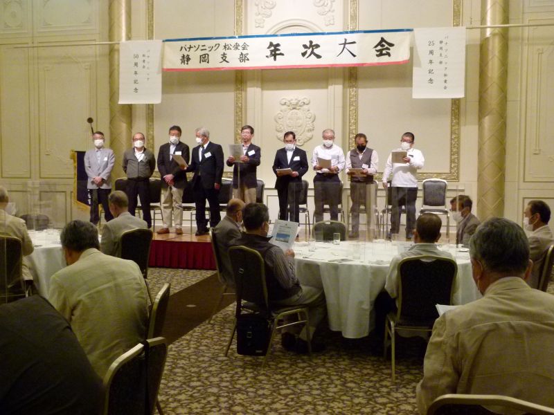 静岡支部の基幹行事であります年次大会が3年ぶりに5月18日(土)にホテルクラウンパレス浜松にて53名が参加し、上島さんの司会で開催されました。今回はコロナ禍での開催のため広めの会場でテーブルにはにはアクリル板をおいた状態で実施。 議事の前に昨年度物故者のご冥福を祈り全員で黙祷を行いました。