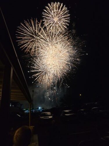 花火が始まってしばらくすると、打ち上げ場所近くで小火が発生したらしく「安全確認のためしばらくお待ちください」というアナウンスが流れ、30分ほど打ち上げが中断しました。