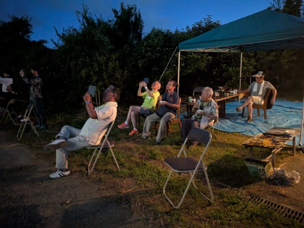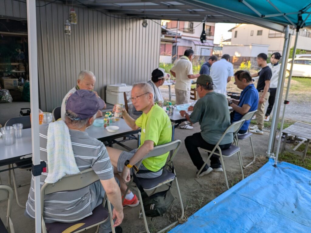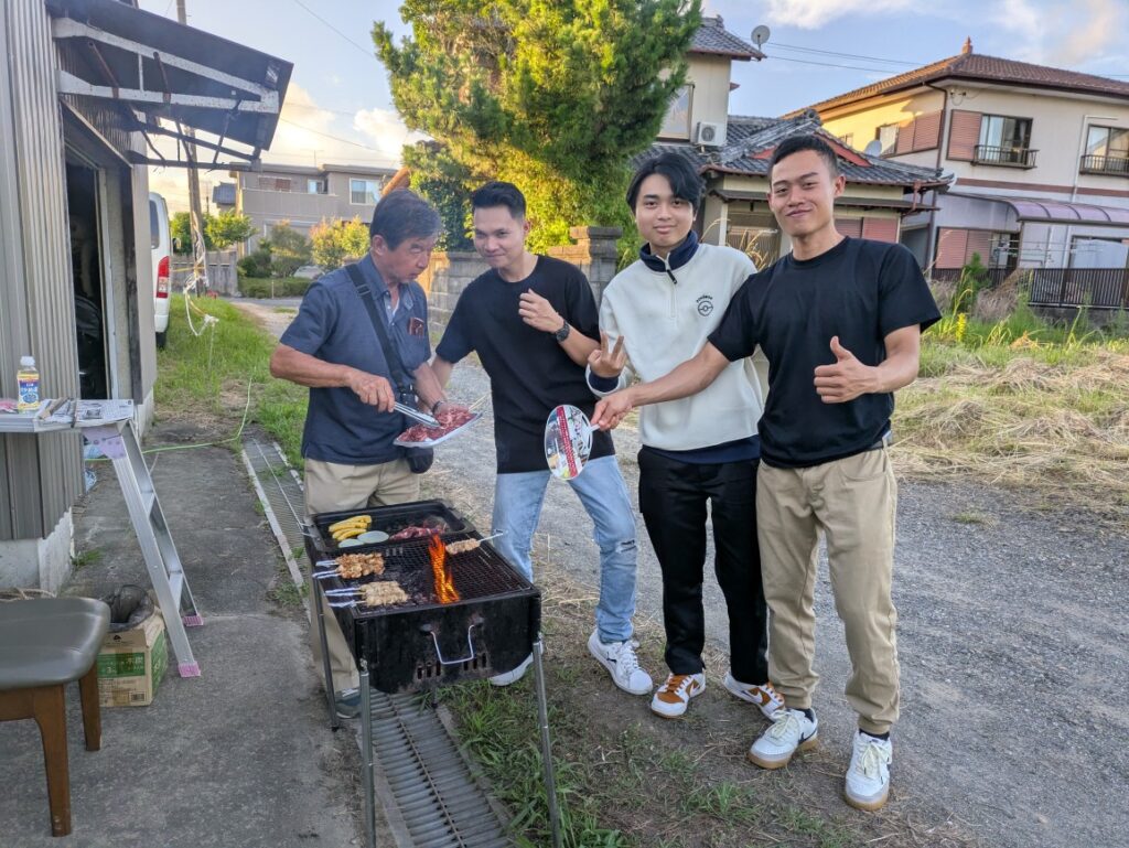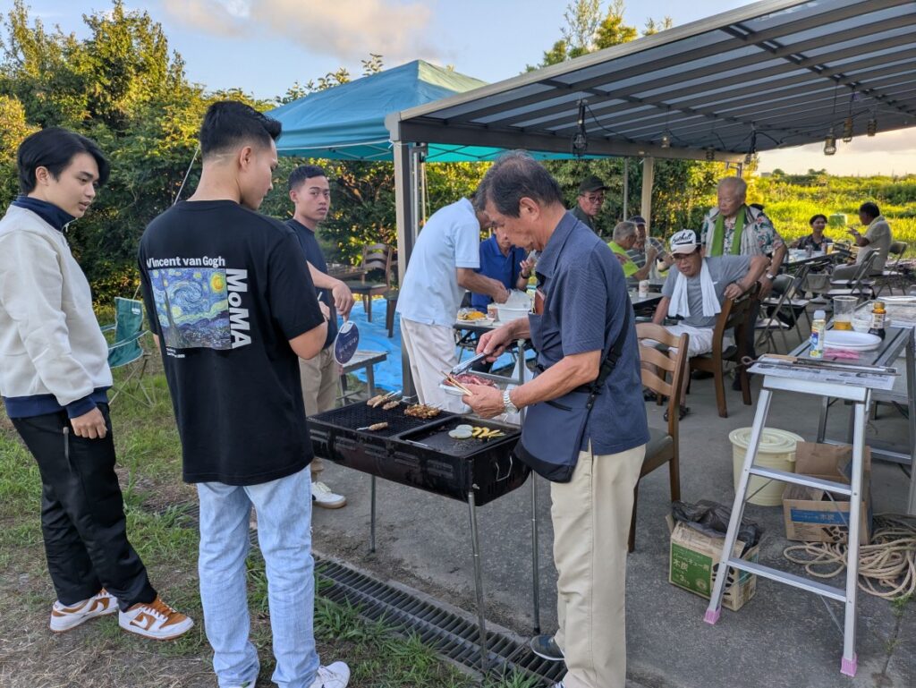 連日の猛暑の中、7月26日に実施された袋井の花火大会に合わせ、白石さんの農園にある農機具小屋の横でBBQと花火鑑賞会を実施しました。今回の参加会員は10名でしたが、昨年11月より洗濯機工場で実習中のインドネシア技能実習生5名を加えた15名で実施しました。