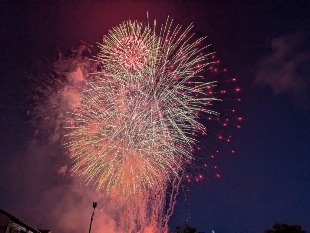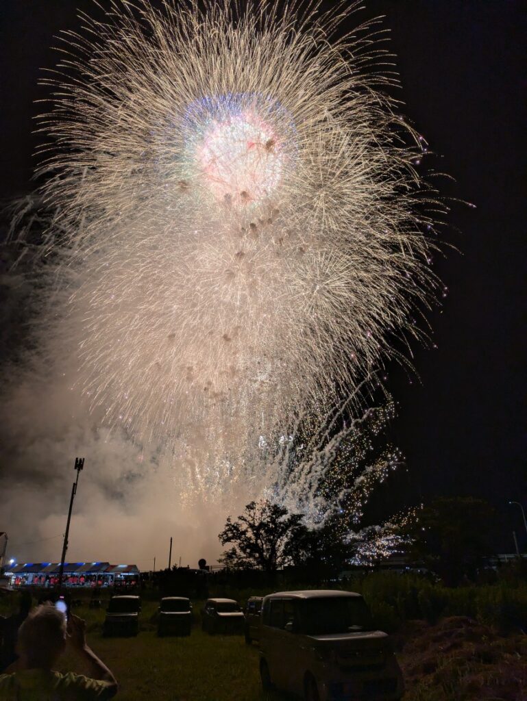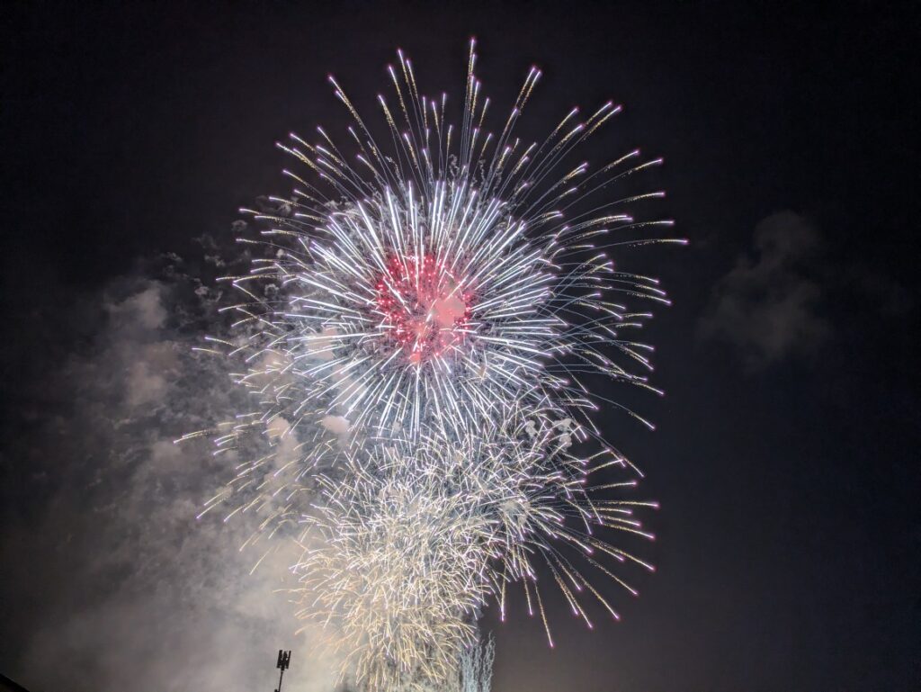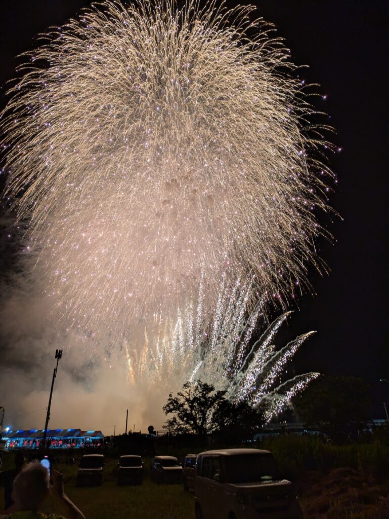 花火は例年通りの盛大なもので、微風というコンディションにより打ち上げ花火の煙もすぐに流れ、次々ときれいな花火が打ち上げられました。