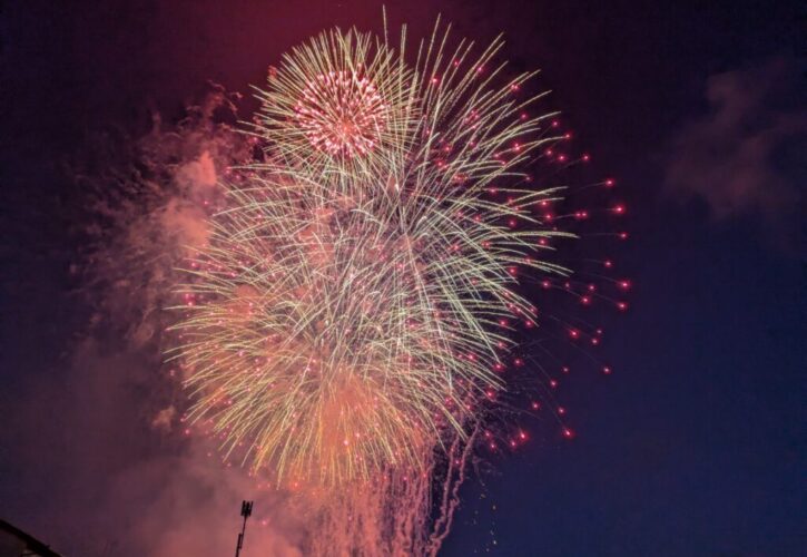 花火は例年通りの盛大なもので、微風というコンディションにより打ち上げ花火の煙もすぐに流れ、次々ときれいな花火が打ち上げられました。
