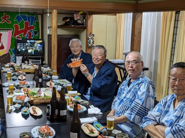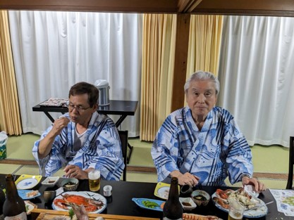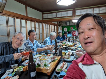 夜の宴会には島名物の海鮮料理が並び、ゆでダコやクルマエビの塩焼き、伊勢海老などが出され、食べきれないほどの量でした。