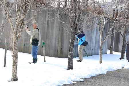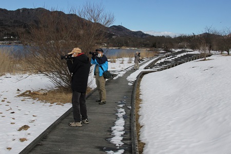 今年は暖冬で雪の量が心配でしたが、数日前の降雪で何とか雪景色を見る事が出来、湖と雪景色を撮影する事が出来ました。 続いて西湖へ移動し西湖野鳥の森公園で撮影しました。 西湖野鳥の森公園では、樹氷まつりを開催中でしたが、暖冬のため樹氷は見られませんでした。