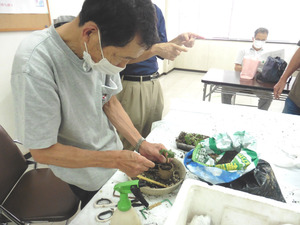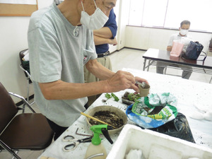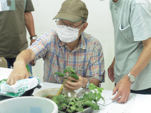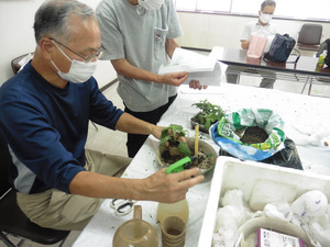 ジフィーポット移植の扱いが難しいとしている方、本挿し芽の育成が遅れた方などは直接5号菊鉢に定植をされる方も居られ、その方の為に直接定植の実習も行った。(下の写真も参照の事)