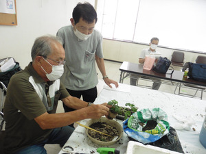 苗、培養土、ジフィーポット、スプレイなどは川久保が準備し、二見さん、石坂さん指導の下、8人が実習をした。(各自の実習状況は写真参照)