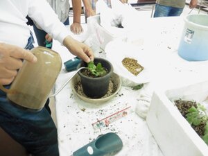 ① ジフィーポットの5号鉢への定植 全員が実習する