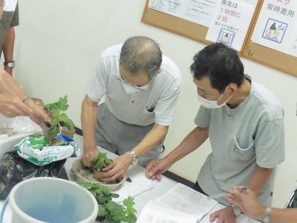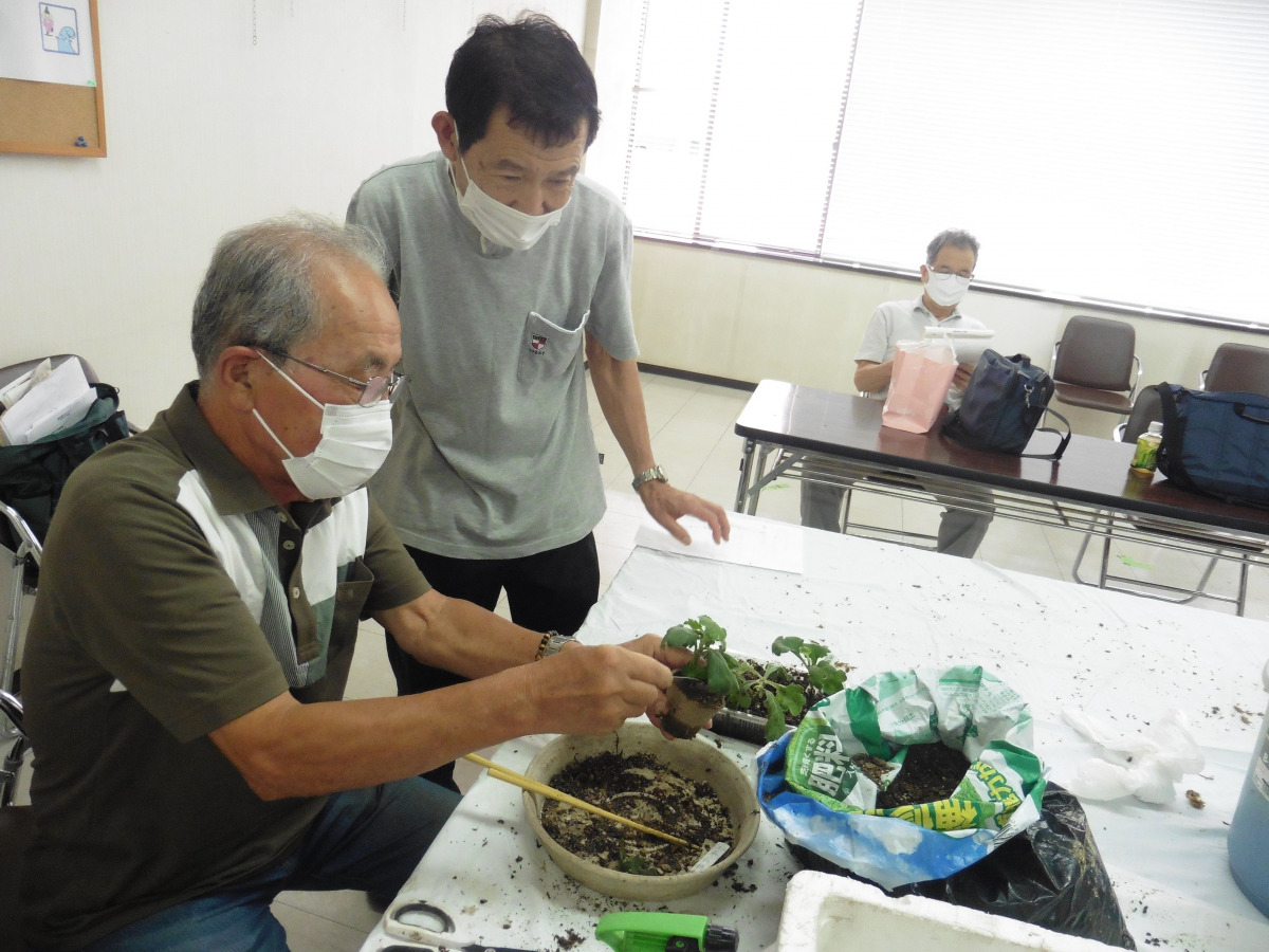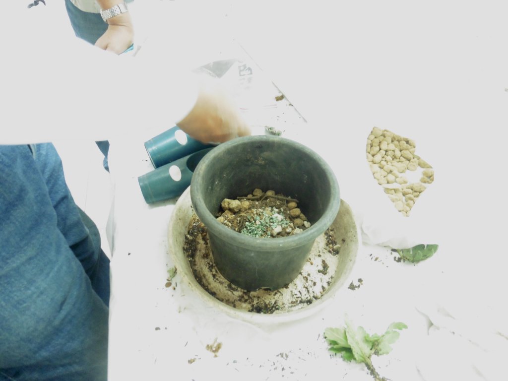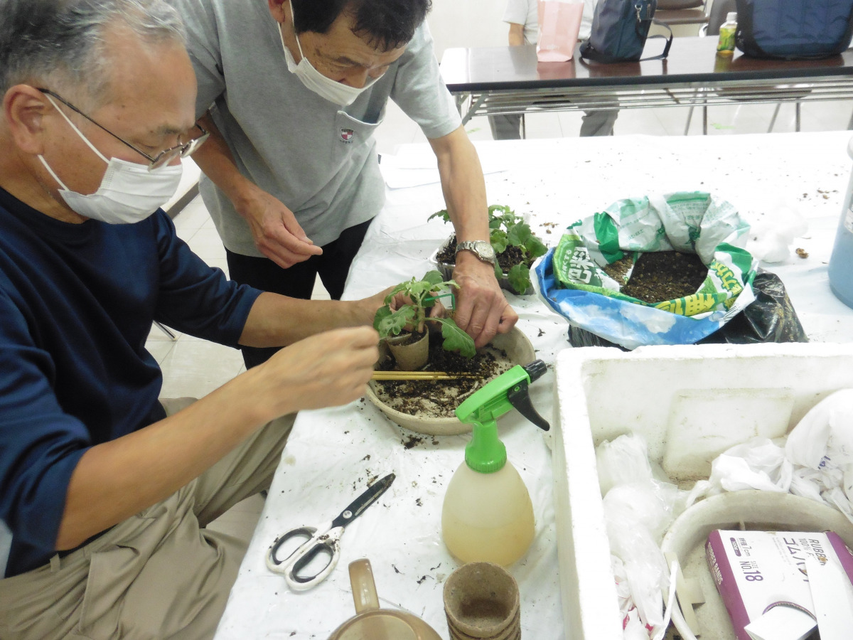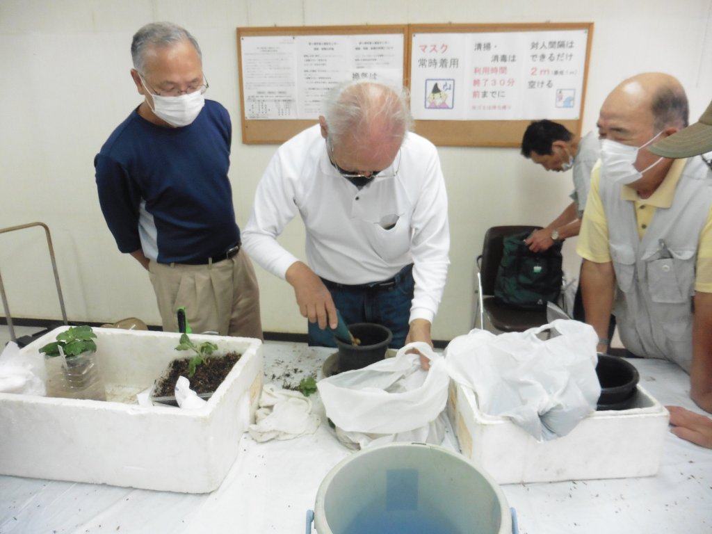 ジフィーポット移植の扱いが難しいとしている方、本挿し芽の育成が遅れた方などは直接5号菊鉢に定植をされる方も居られ、その方の為に直接定植の実習も行った。(下の写真も参照の事)