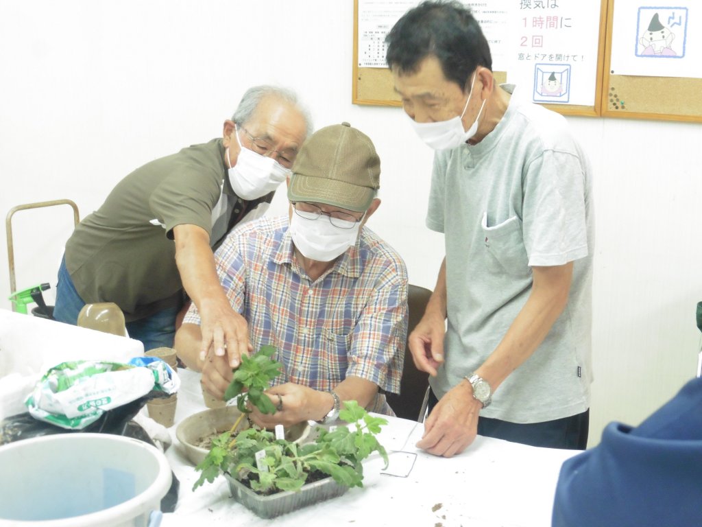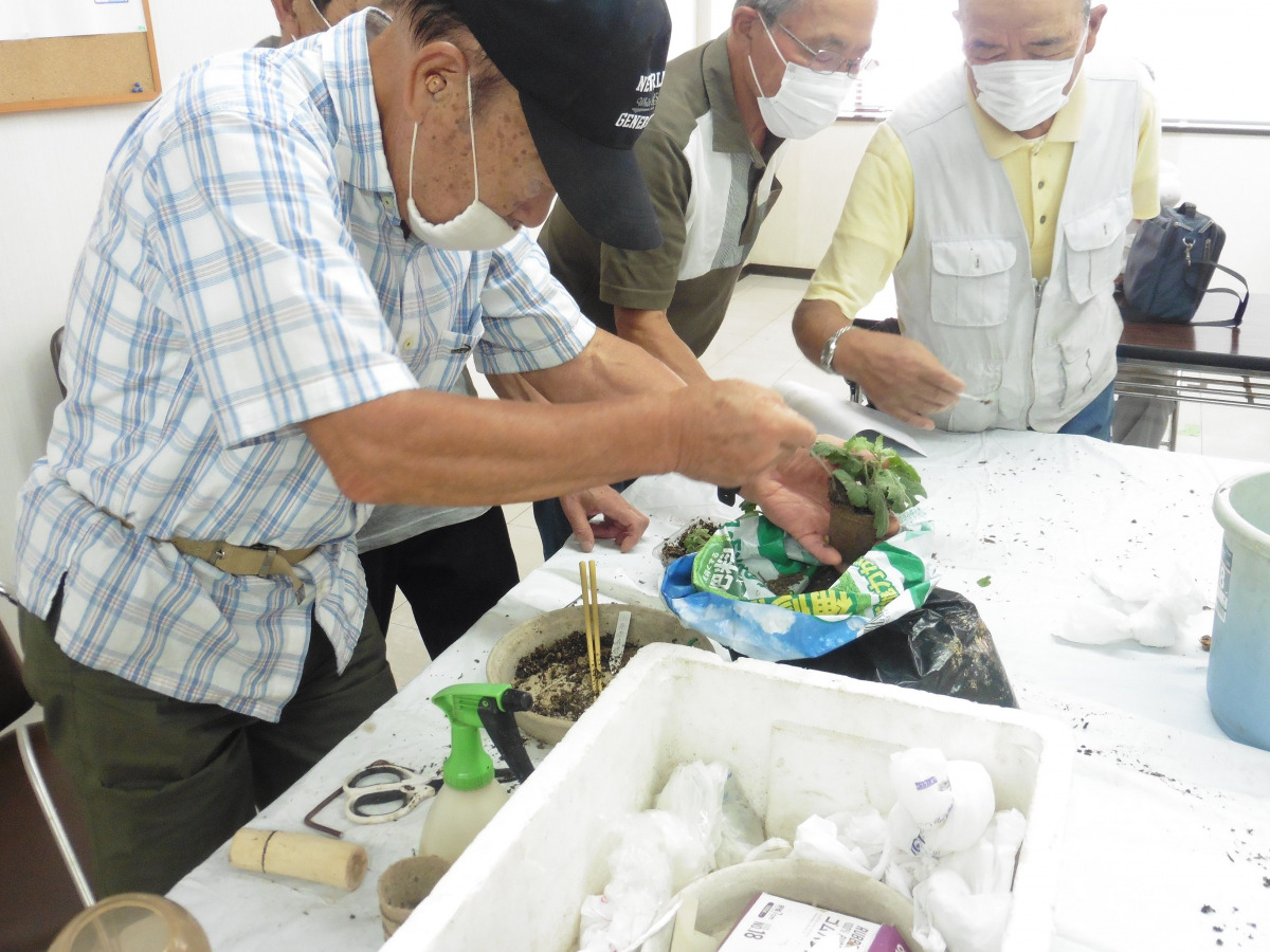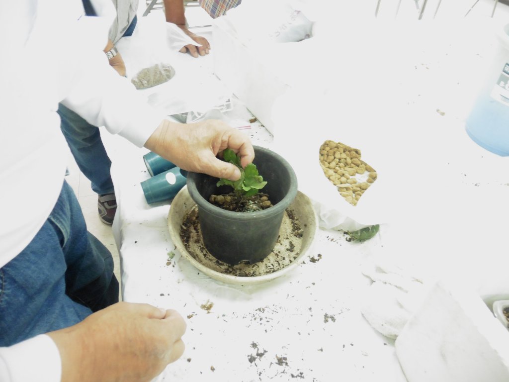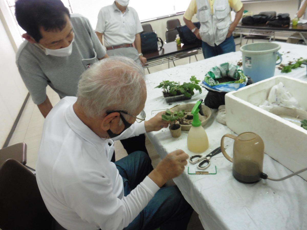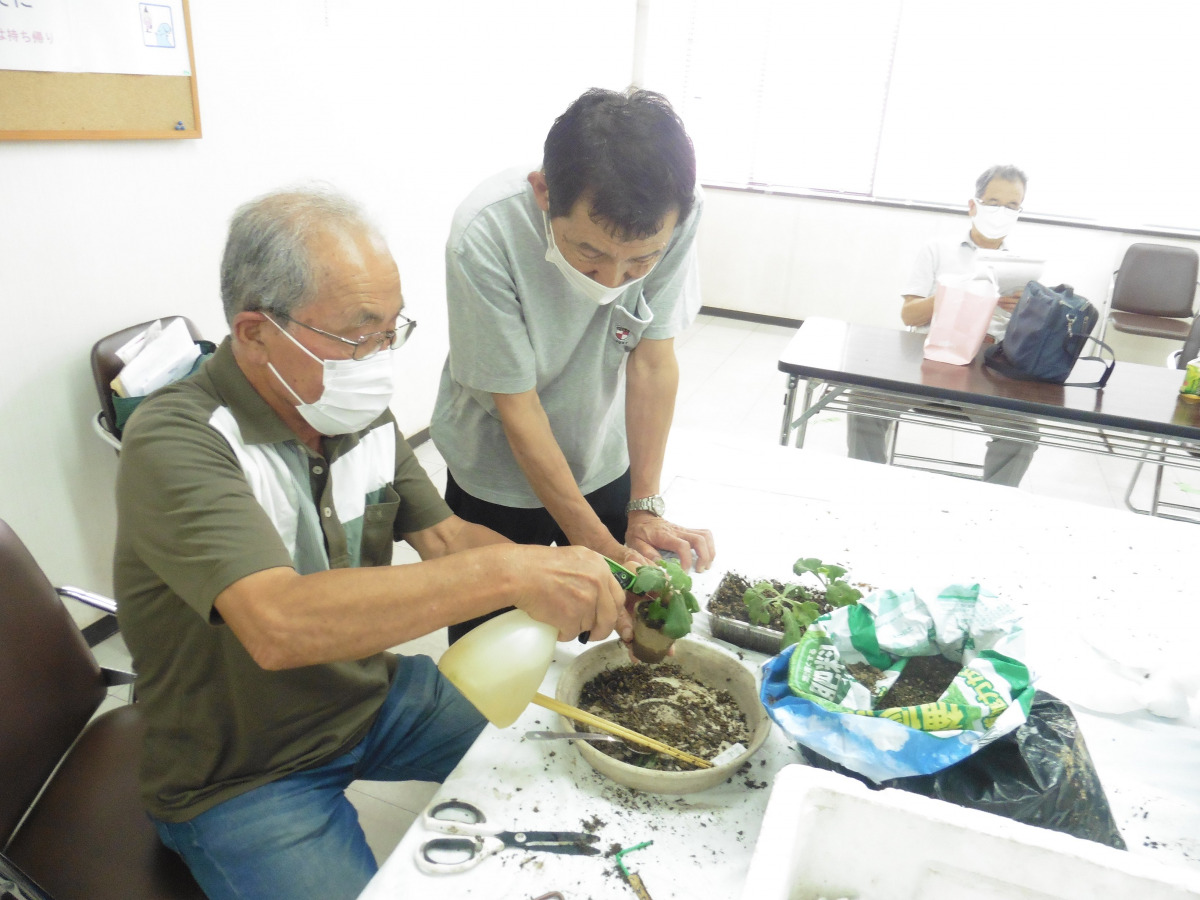 ジフィーポット移植の扱いが難しいとしている方、本挿し芽の育成が遅れた方などは直接5号菊鉢に定植をされる方も居られ、その方の為に直接定植の実習も行った。(下の写真も参照の事)