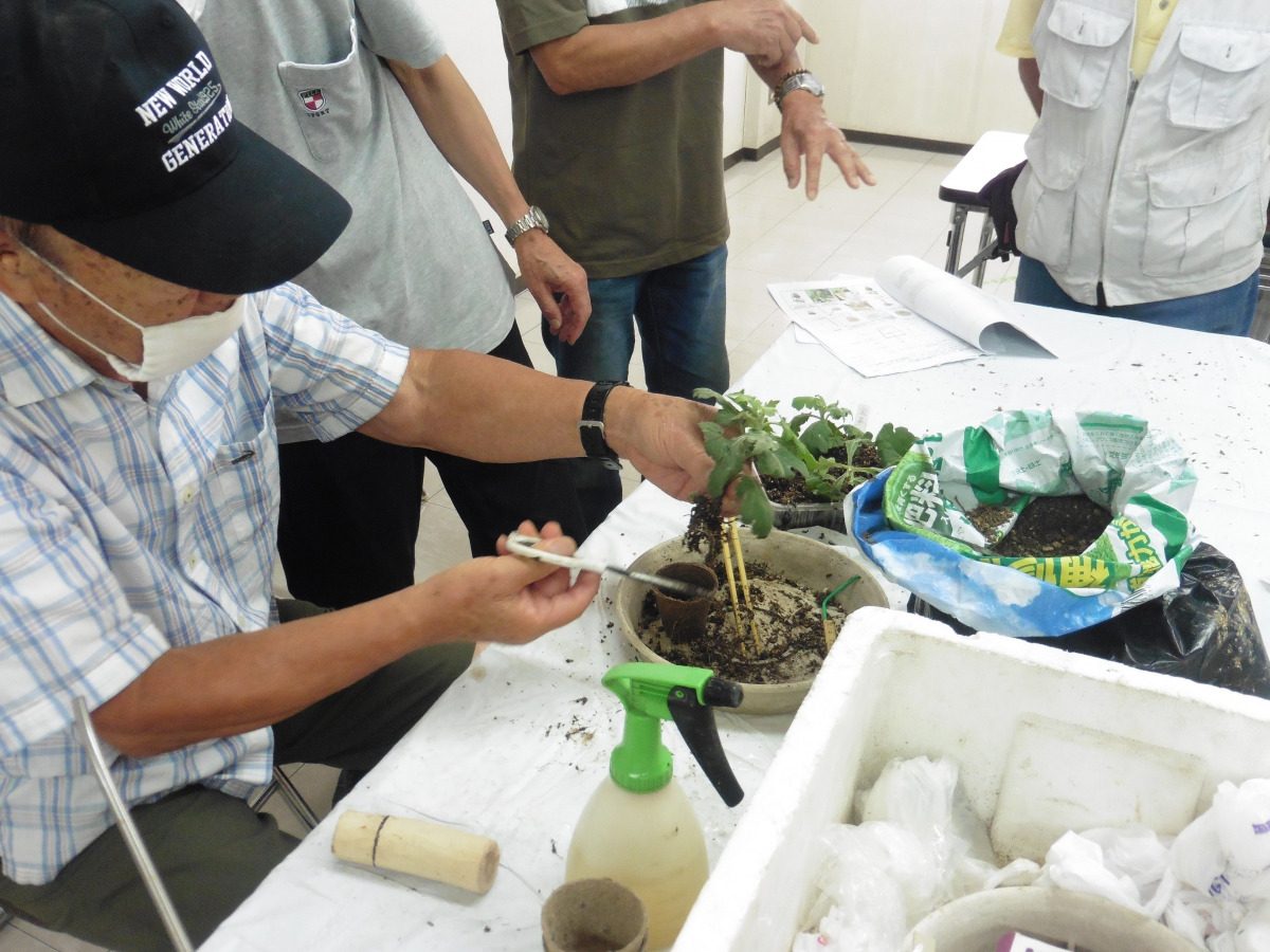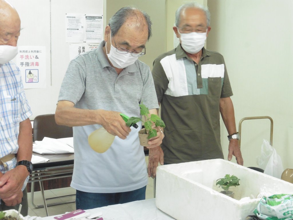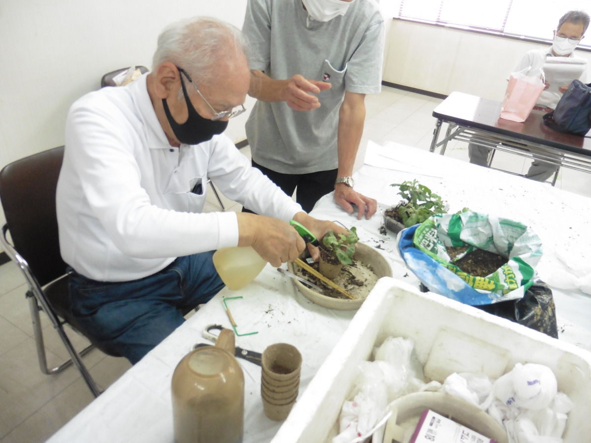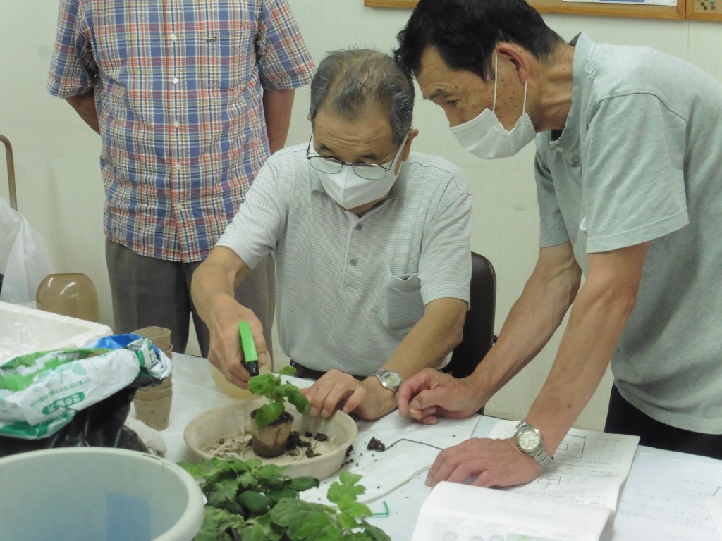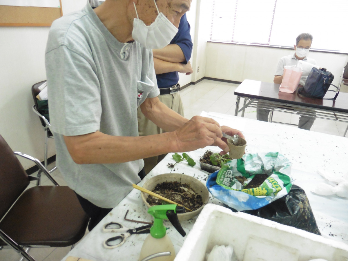 苗、培養土、ジフィーポット、スプレイなどは川久保が準備し、二見さん、石坂さん指導の下、8人が実習をした。(各自の実習状況は写真参照)
