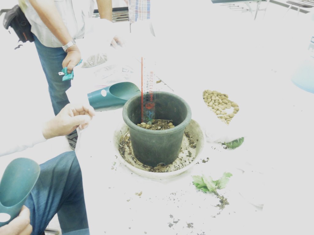 ③ 各自、5号鉢を持ってくる。出来れば、5号鉢に底網、ゴロ土(又はヤシマット)、その上に鉢上端から9cmの深さまで培養土を入れて、元肥大匙2杯を加え、水を散布、培養土とよく混ぜて置く(出来れば10日前に行う事)テキストでは「乾燥肥料となっているが、元肥の誤り」です。