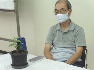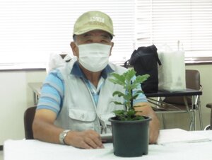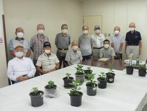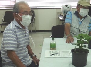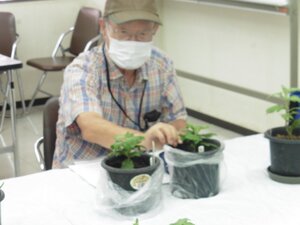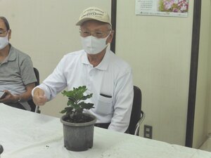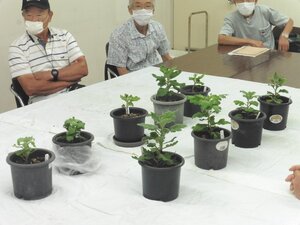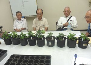 ① 8月6日に、ポット上げした苗を5号鉢へ定植してから1か月余り、各自の育成状況を相互チェックし、今後の育成に役立てる事を勉強会の目標とし、それぞれの育成の苦労話をして頂いた。
