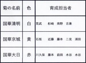 - 柳川氏提供の3種の福助菊と育成担当者