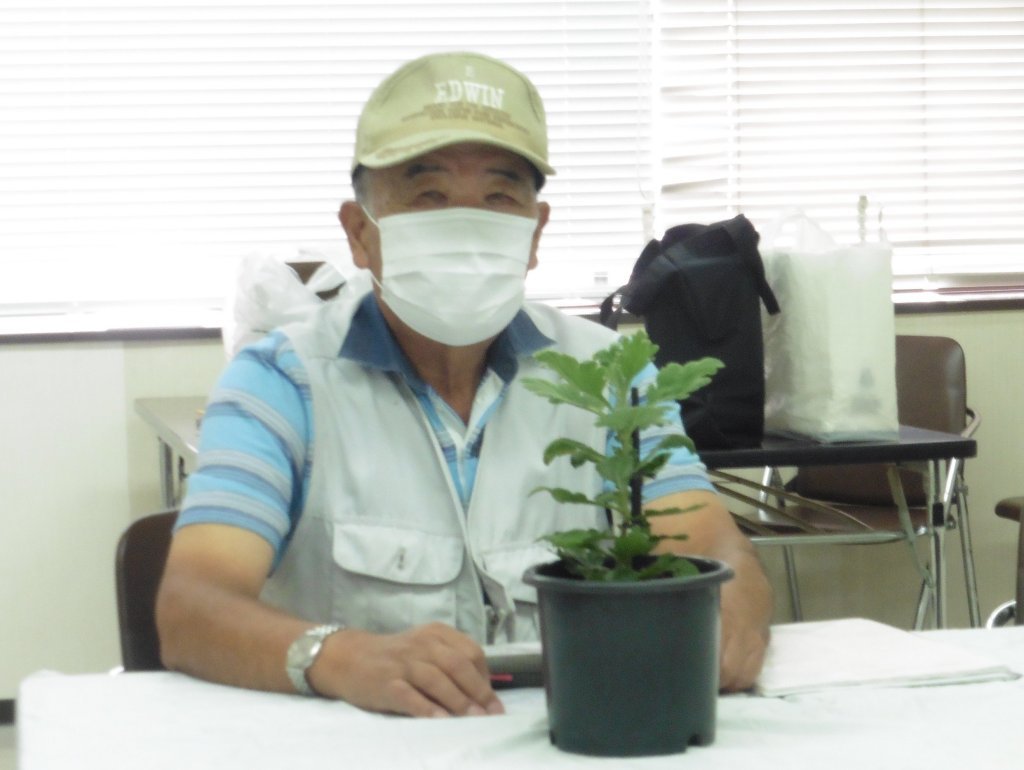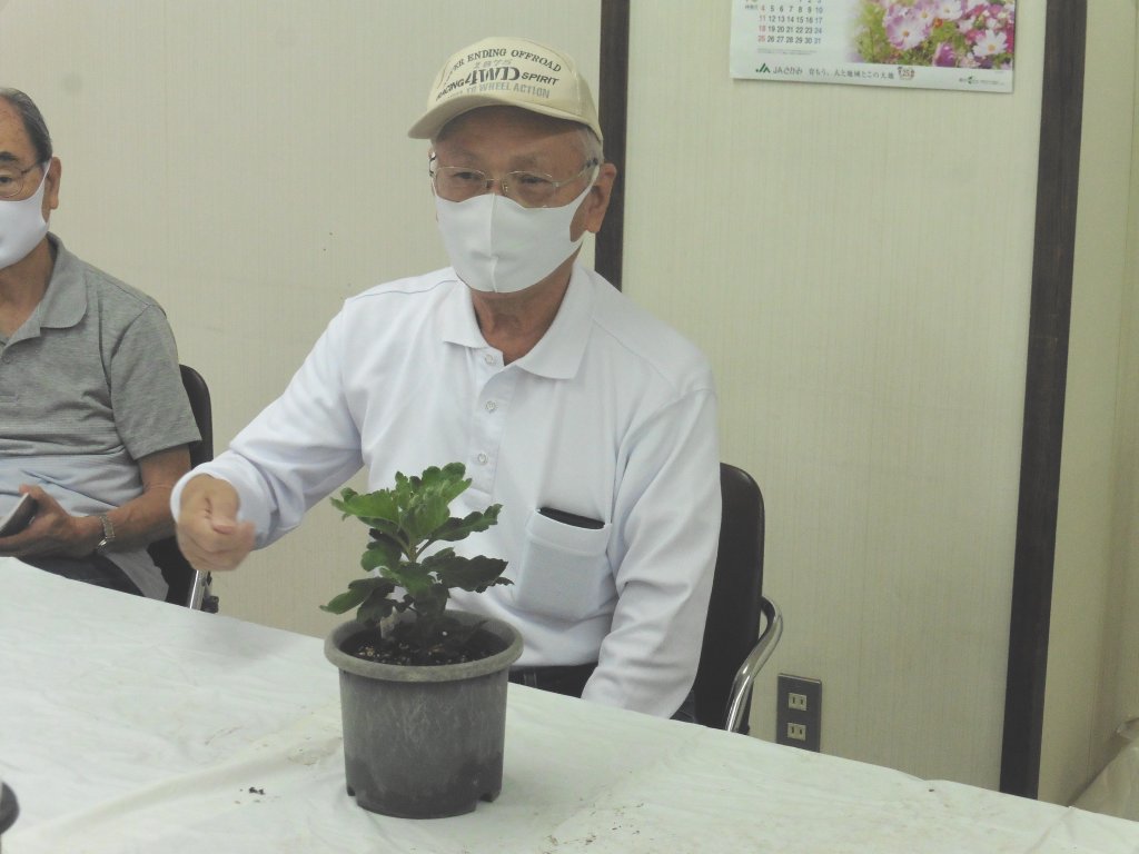 対象の苗は、8月6日に柳川氏から提供されたポット上げされた3種類、15本と別に各自が育てている福助菊である。発言順に以下その趣旨を列挙する。各自の持参福助菊は下に写真で示す。