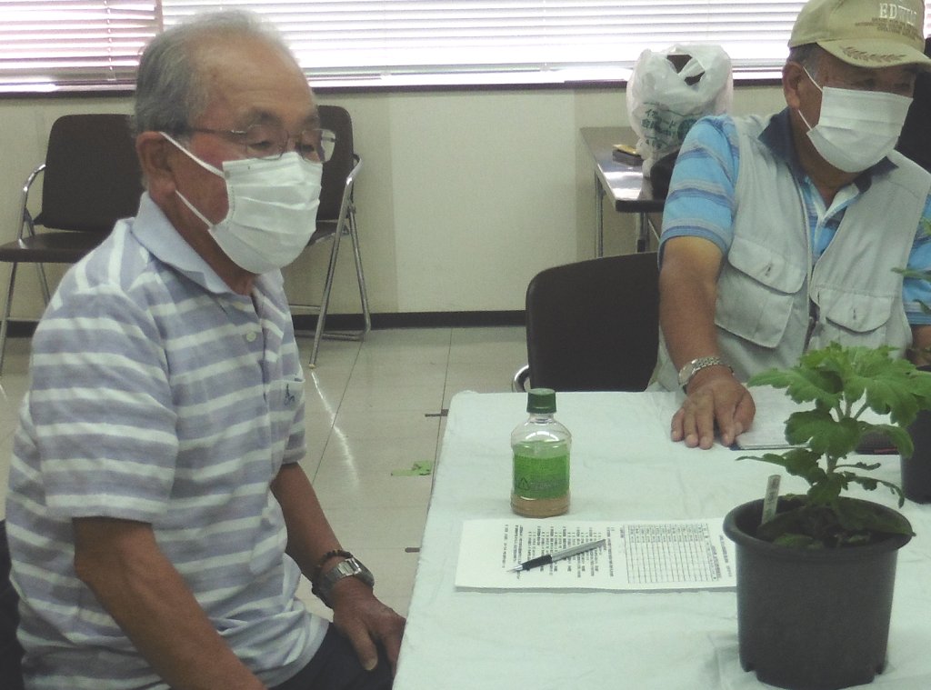 ① 8月6日に、ポット上げした苗を5号鉢へ定植してから1か月余り、各自の育成状況を相互チェックし、今後の育成に役立てる事を勉強会の目標とし、それぞれの育成の苦労話をして頂いた。