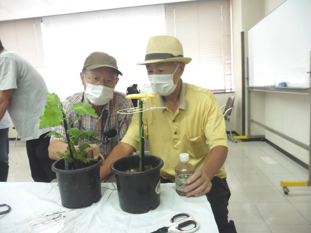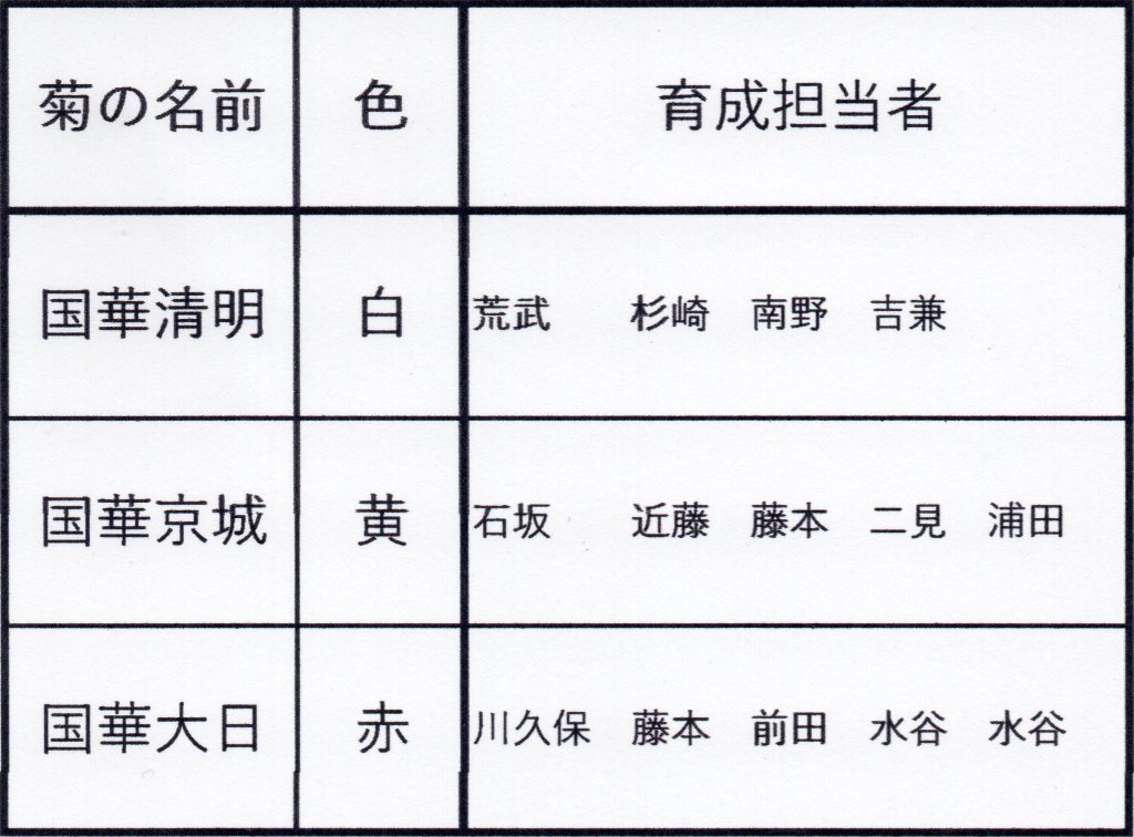 育成・開花した菊を各自2鉢以上持参する事。対象菊は福助菊・ドーム菊・ざる菊・他。