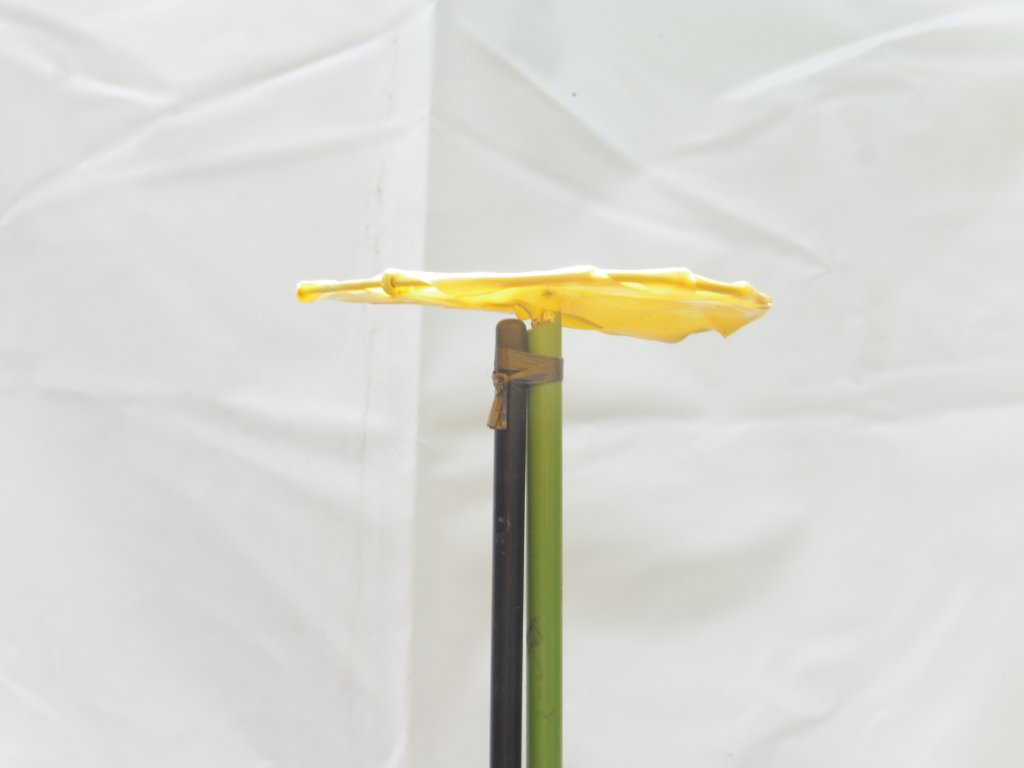 ② 支柱立てと輪台の取り付け:ほとんどの方は、十分に経験済みだが、確認の為、模型を使って、支柱立て、輪台通り付けを実習した。現物の福助菊は未だ輪台を付けるまでに成長して無く、世話役が花が開き始めた状態の模型を準備した。取付手順を下の写真で説明する。
