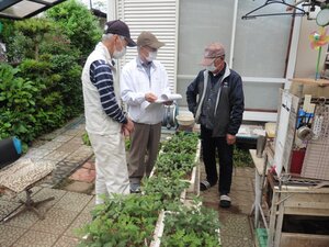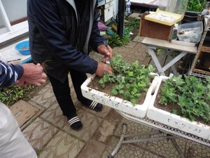 第1の課題は発根した苗の交換と配布であるが、挿し芽が順調に進んだ藤本さん(藤沢市)と荒武さん(茅ヶ崎市)のお宅に、都合付く各4名ずつが集まり、苗の交換、配布を受けた。