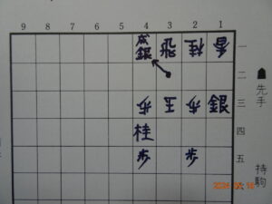 ヒント:駒が多く少し煩雑ですが、4ニの銀が動けば飛車筋が通り王手となります。さて銀をどこに動かしますか?