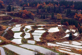翌日は5時起床、残念ながら「みぞれまじり」の土砂降りのため早朝撮影を断念。朝食までの2時間、前日撮った写真の個別評価を行いました。 そして朝食後小雨の中、宿を出発。昨日取り残した一番のビュ-ポイントの棚田へ、幸い雨もやみ水を張った静かな朝の棚田風景をカメラに収め、その後次の紅葉スポットへ移動しました。