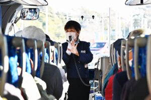 川越の街を離れ帰路に、車内では、川越のお土産を手に、バスガイドさんからの