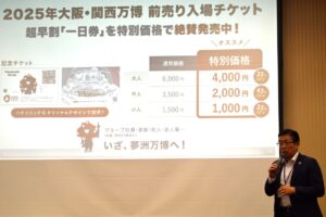 特に、片倉支店長から大阪万博のPRビデオと説明の中で、本年9月まで前売り入場券購入は