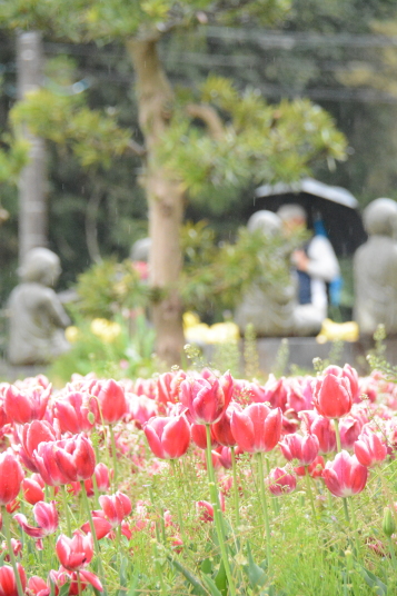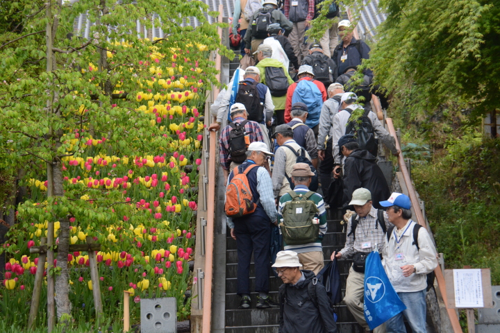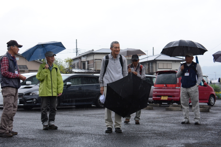 平成時代最後の歩こう会は、あいにく雨の中で始まりました。二ツ塚のミーティング、千村配水場の八重桜鑑賞、チューリップ寺さらに昼食休憩後の白山神社、頭高山登山口まで雨が強弱を繰り返しながら降っていました。雨の予想と登山道の状態が読めなかったため、登山と帰路の要望を聞き26名が登山を続行、4名が帰路に着くことになりました。
