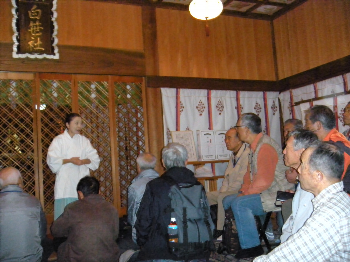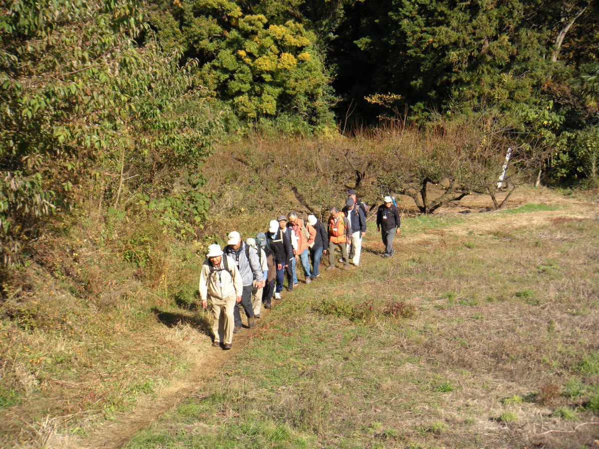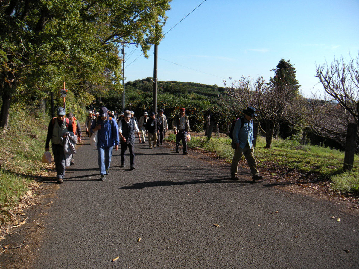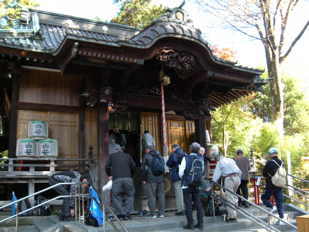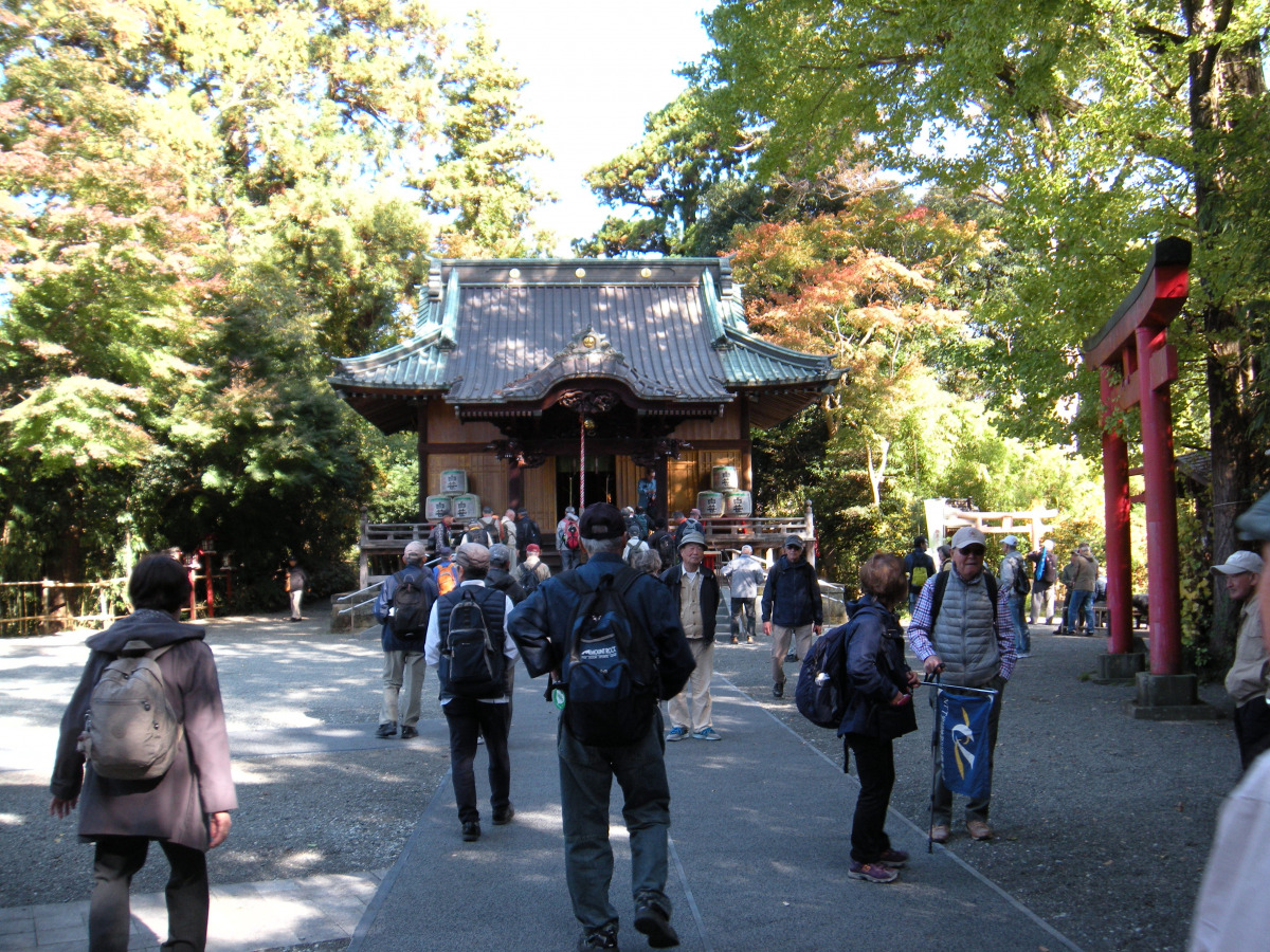 | 起床時はまだ肌寒さを感じていましたが、小田急秦野駅に9時頃着いた時は気温が急上昇してきて暖かな秋晴れの中、36名が集まり気持ちの良い歩こう会を実施することができました。関東三大稲荷と言われている白笹稲荷神社は今までトイレ休憩で立ち寄っていただけでしたが、今回秦野市在住佐野さんの口添えで大学の後輩でもある女性宮司さんを紹介して頂き、本殿に上り神社の歴史や天井画の説明を拝聴しました。稲荷神社の意味を再確認する知識が得られました。台風15号がもたらした強風はミカン園でも見られ、実を付けたまま倒れた木もまだ残っていました。ミカンの木の寿命は50年ほどらしいですが、成長すると一本の木で1000個位の実を付けるそうです。歩こう会で訪れてミカン狩りしても、殆ど減っていないように見えるのも納得しました。毎年のことながら、帰路は往路に比べて背中にリュックの重みを感じる歩こう会でした。