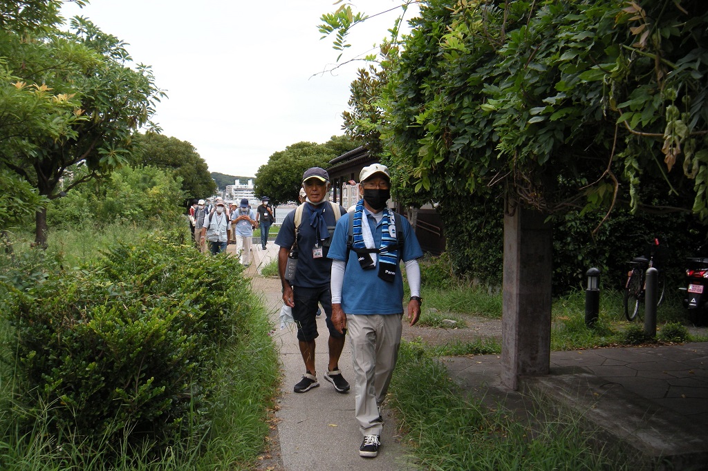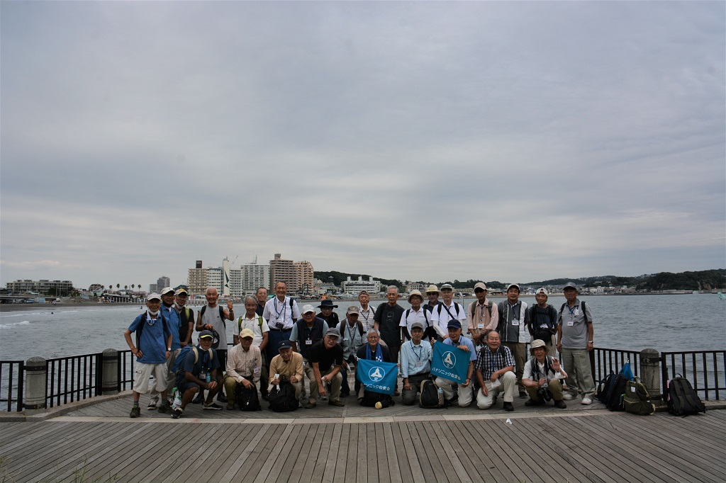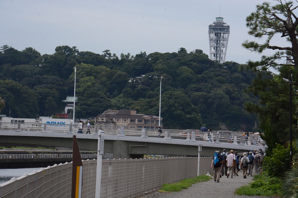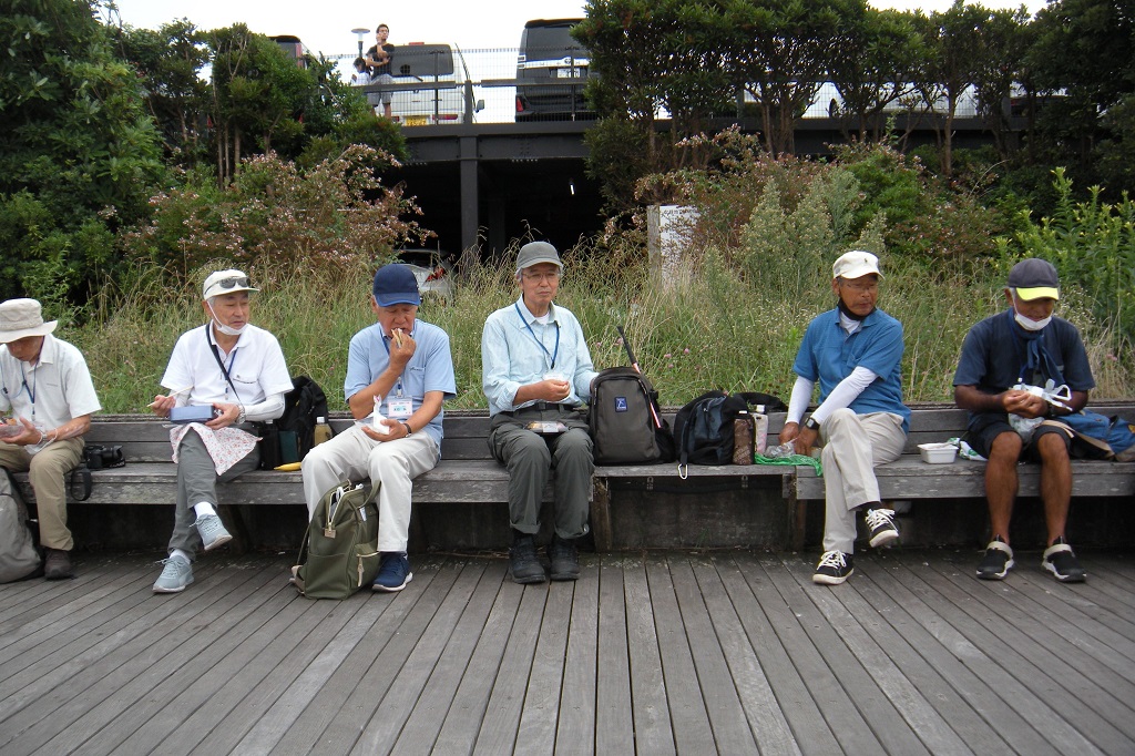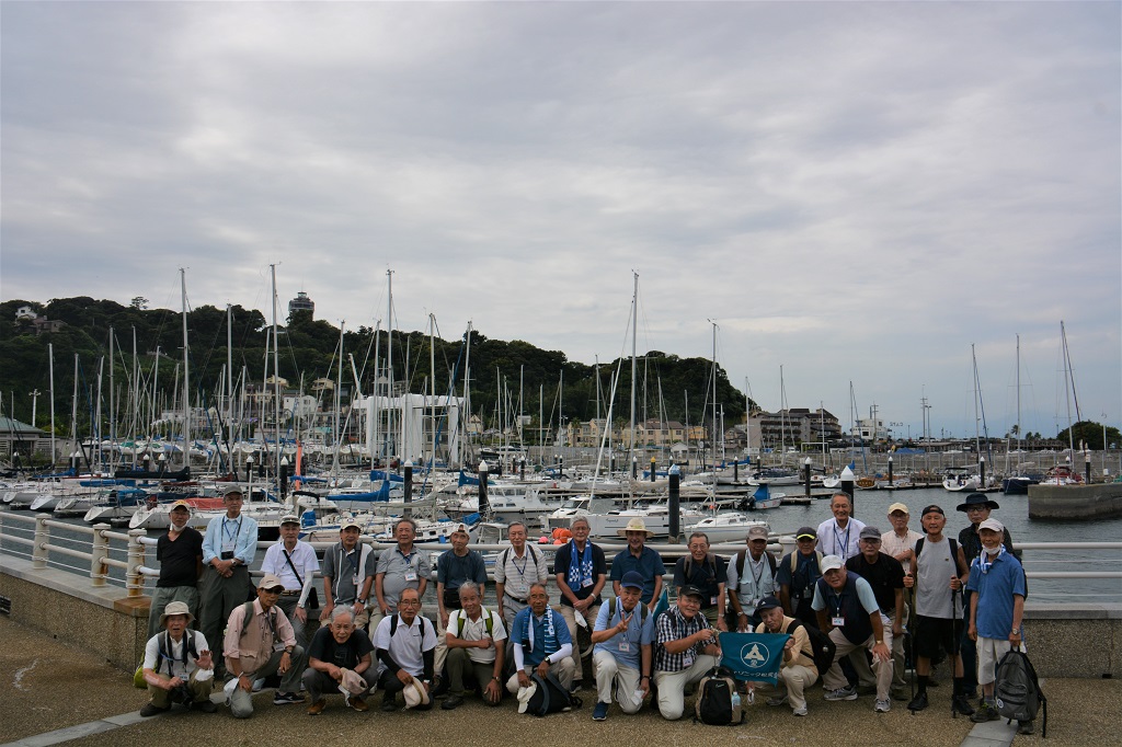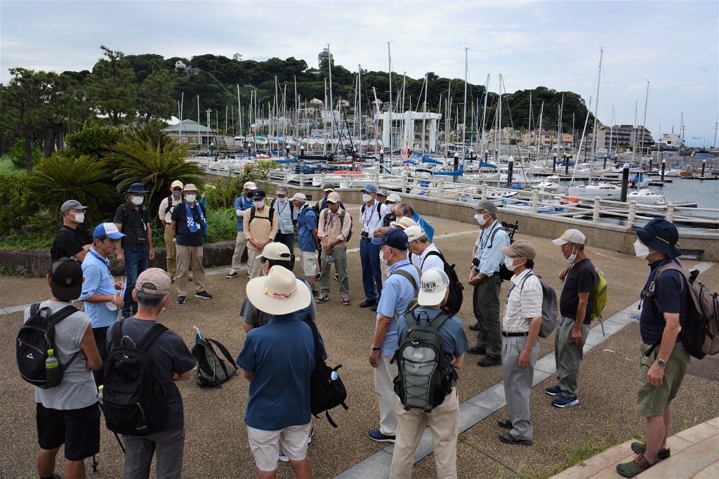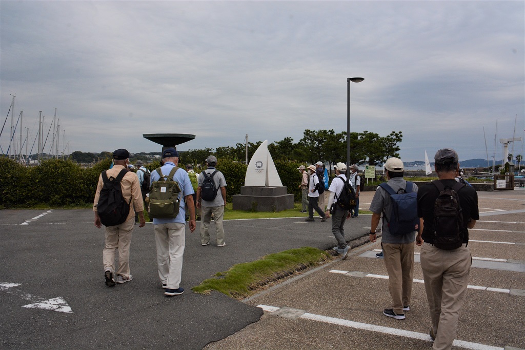 一週間前の天気予報は傘マークがあり開催が心配されましたが、当日は曇りで気温も30℃まで届かず安心して36名(下見時6名含む)開催できました。境川沿いに江ノ島に向けて南風に吹かれながら南下しました。江ノ島に到着しオリンピック記念噴水池隣接のロングベンチの設置されたウッドデッキを歩こう会で独占し、片瀬海岸東浜を眺望しながら昼食休憩をとりました。昼食後は普段行かないヨットハーバーの見物で、海風に吹かれながら2回の東京オリンピックセーリング開催場所を巡りました。真夏の潮風ウォーキングは満足してもらえたでしょうか。