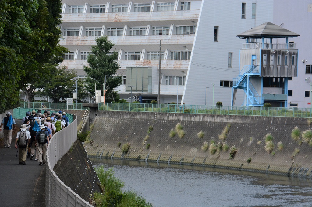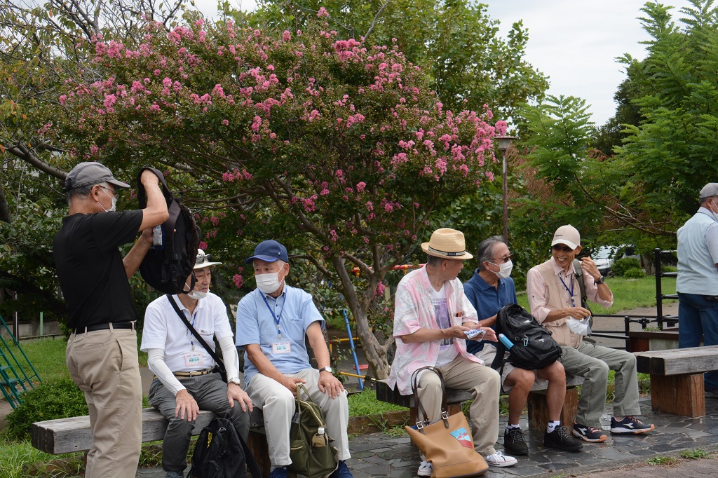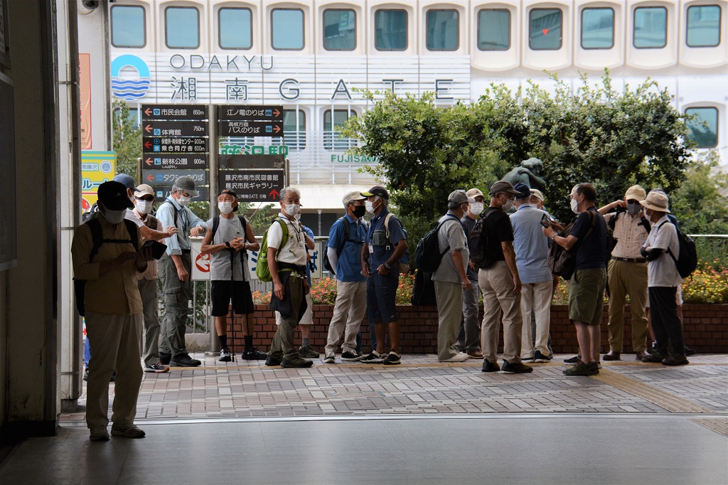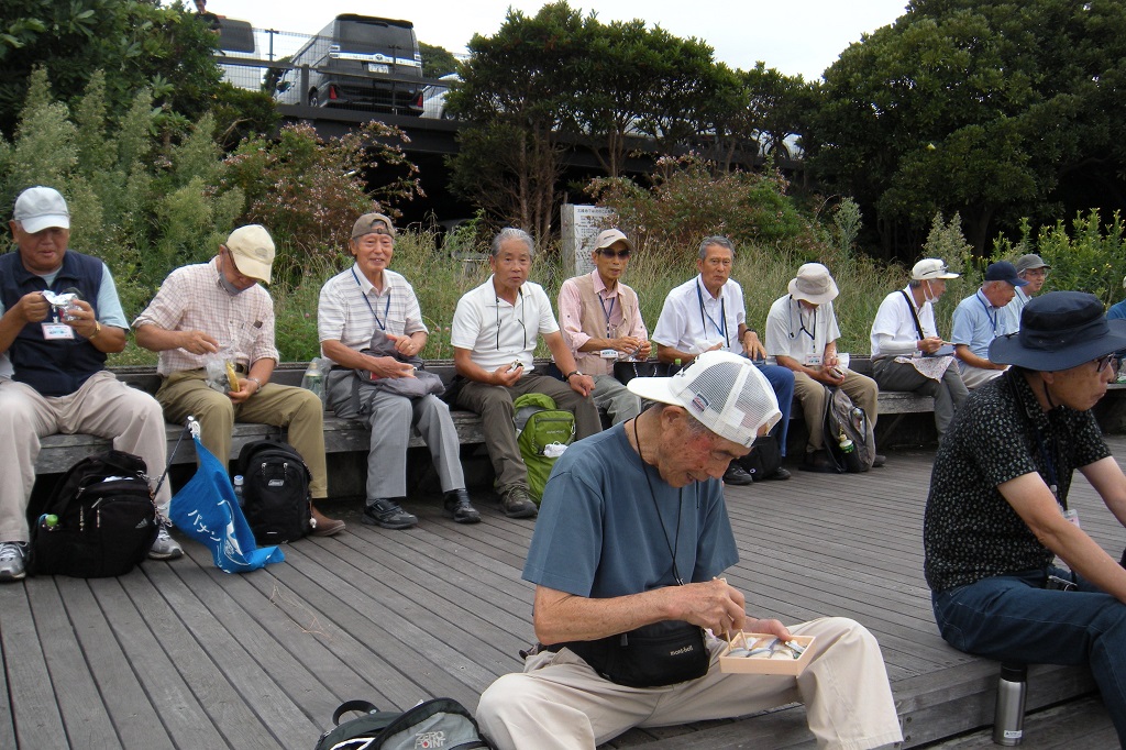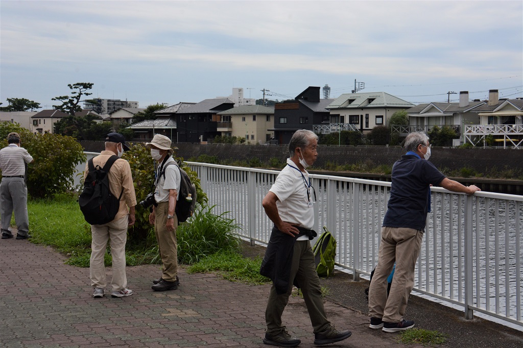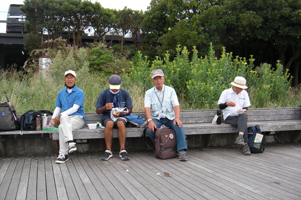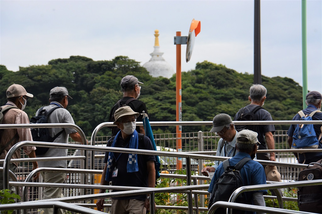 一週間前の天気予報は傘マークがあり開催が心配されましたが、当日は曇りで気温も30℃まで届かず安心して36名(下見時6名含む)開催できました。境川沿いに江ノ島に向けて南風に吹かれながら南下しました。江ノ島に到着しオリンピック記念噴水池隣接のロングベンチの設置されたウッドデッキを歩こう会で独占し、片瀬海岸東浜を眺望しながら昼食休憩をとりました。昼食後は普段行かないヨットハーバーの見物で、海風に吹かれながら2回の東京オリンピックセーリング開催場所を巡りました。真夏の潮風ウォーキングは満足してもらえたでしょうか。