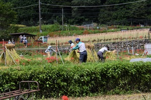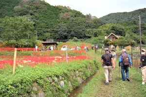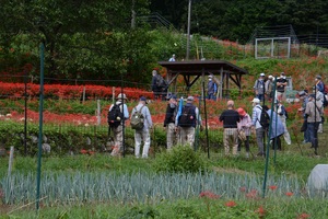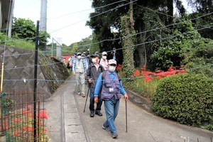 一昨年(台風),昨年(コロナ禍)はやむを得ず中止にしましたが、今年は29名(下見時5名含む)の参加で2年越しの開催となりました。天候に不安がありましたが帰りの石雲寺から日向薬師バス停までの間に霧雨が降る程度で済みました。日向地区の彼岸花は水田の畦道に群生しているので、時期的に刈り取り前の稲穂や刈り取られて天日干しされている稲穂さらに枯れて下を向いているヒマワリの花など、都市部では見られない原風景を久しぶりに満喫しました。彼岸花は普段赤色しか見ていないので、白色や黄色を見て新鮮な驚きでした。次回は雨で中止となった2018年の前小松コスモス園へのウォーキングですが、3年越しの無事開催を祈るばかりです。