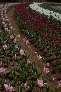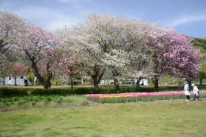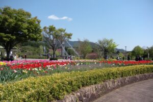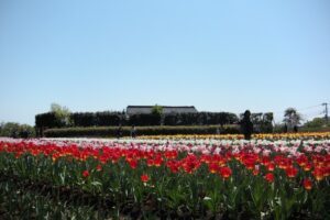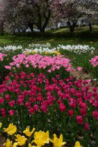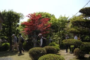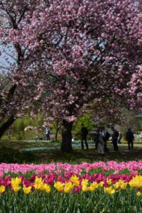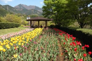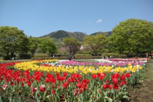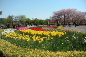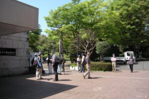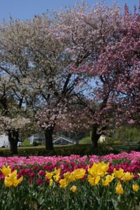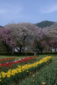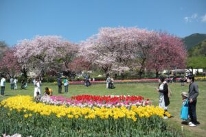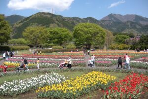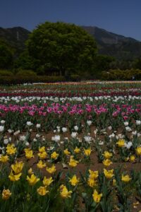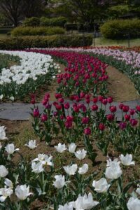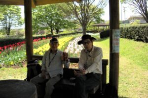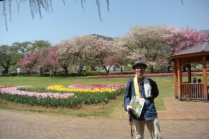 快晴の青空の下に41名(下見時6名含む)が集まり、小田急渋川駅から桜土手古墳公園・はだの歴史博物館を見学し、水無川河川敷(ハイキングコースが整備)を上流に向かって歩き県立秦野戸川公園でチューリップと八重桜及び風光明媚な景色を堪能しました。黄砂飛来の天気予報でしたが、歩いている時にはその影響は全く感じられませんでした。戸川公園は下見が4日前の日曜日でしたので多くの家族連れで賑わっていましたが、本番は平日でしたのでかなりゆったりと見物できました。球根を取るために少し早く咲いたチューリップは花が切り取られている花壇も少しありましたが、それでも色とりどりのチューリップが楽しめました。また、風の吊り橋を渡った対岸の日本庭園では、御衣黄桜(ギョイコウザクラ)という淡緑色の花の珍しい桜を見ることができました。最も知らなければ目立たないので見過ごしてしましますけど。桜土手古墳公園前の水無川は川面に水が全く流れてなく(普段川の地面の下を流れているそうです)、上流の公園が近くなると水が現れてくるのは水無川の名前の由縁が理解できました。