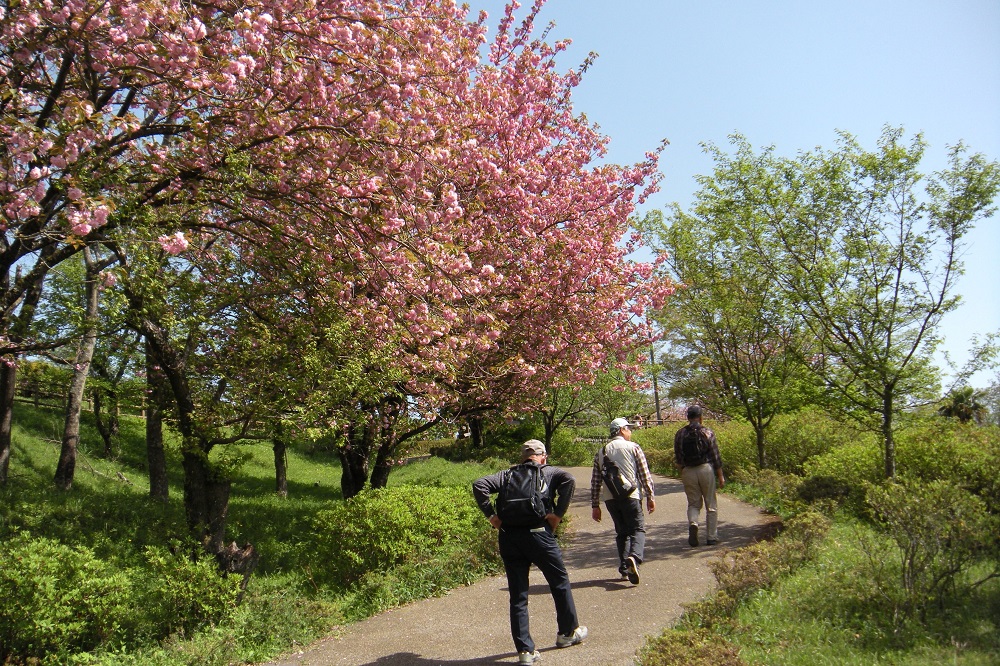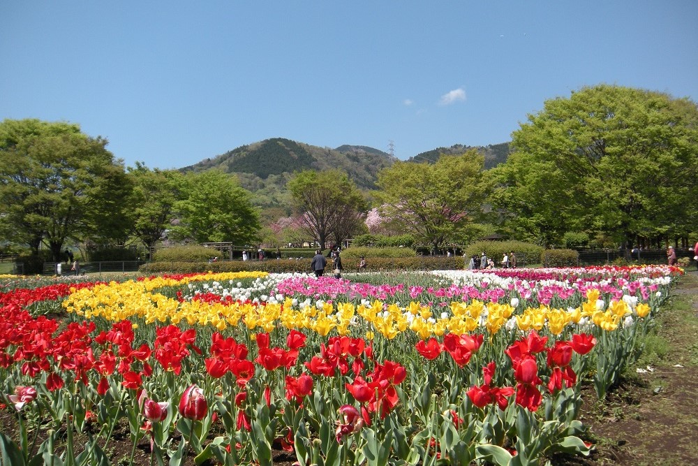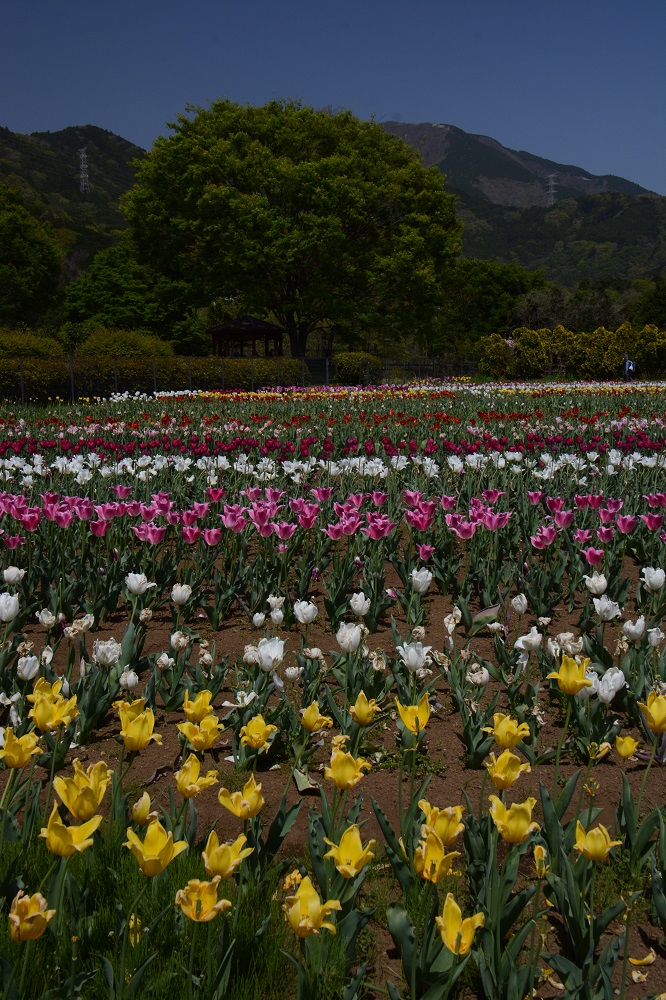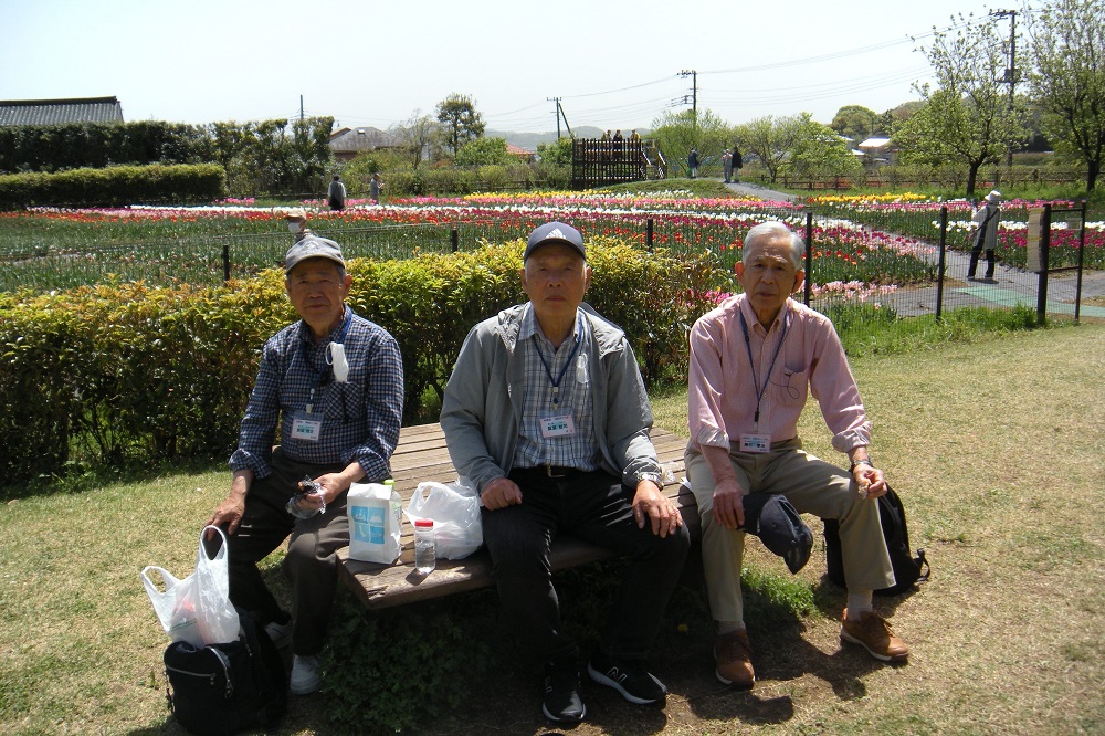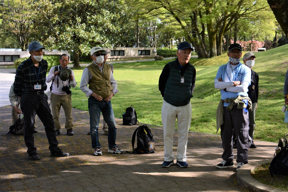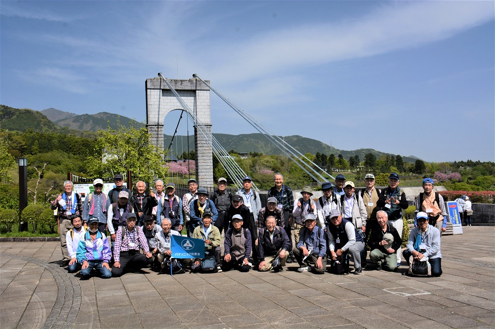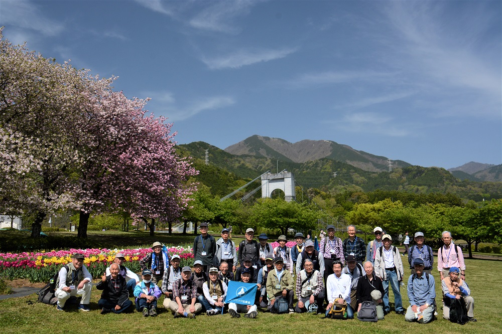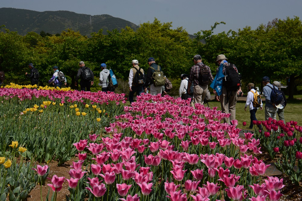 快晴の青空の下に41名(下見時6名含む)が集まり、小田急渋川駅から桜土手古墳公園・はだの歴史博物館を見学し、水無川河川敷(ハイキングコースが整備)を上流に向かって歩き県立秦野戸川公園でチューリップと八重桜及び風光明媚な景色を堪能しました。黄砂飛来の天気予報でしたが、歩いている時にはその影響は全く感じられませんでした。戸川公園は下見が4日前の日曜日でしたので多くの家族連れで賑わっていましたが、本番は平日でしたのでかなりゆったりと見物できました。球根を取るために少し早く咲いたチューリップは花が切り取られている花壇も少しありましたが、それでも色とりどりのチューリップが楽しめました。また、風の吊り橋を渡った対岸の日本庭園では、御衣黄桜(ギョイコウザクラ)という淡緑色の花の珍しい桜を見ることができました。最も知らなければ目立たないので見過ごしてしましますけど。桜土手古墳公園前の水無川は川面に水が全く流れてなく(普段川の地面の下を流れているそうです)、上流の公園が近くなると水が現れてくるのは水無川の名前の由縁が理解できました。