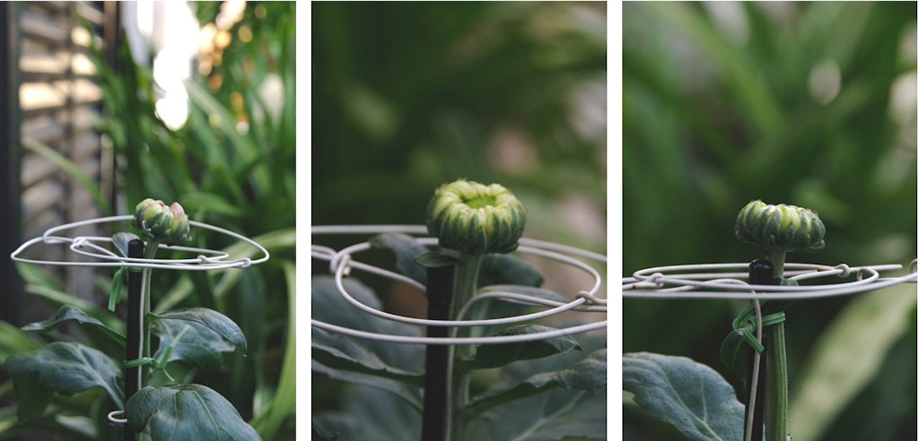 だるま菊(7号鉢で3本立て)背丈は目標の60cmにほぼ出来た、3本は天地人の高さに上手く出来そう。