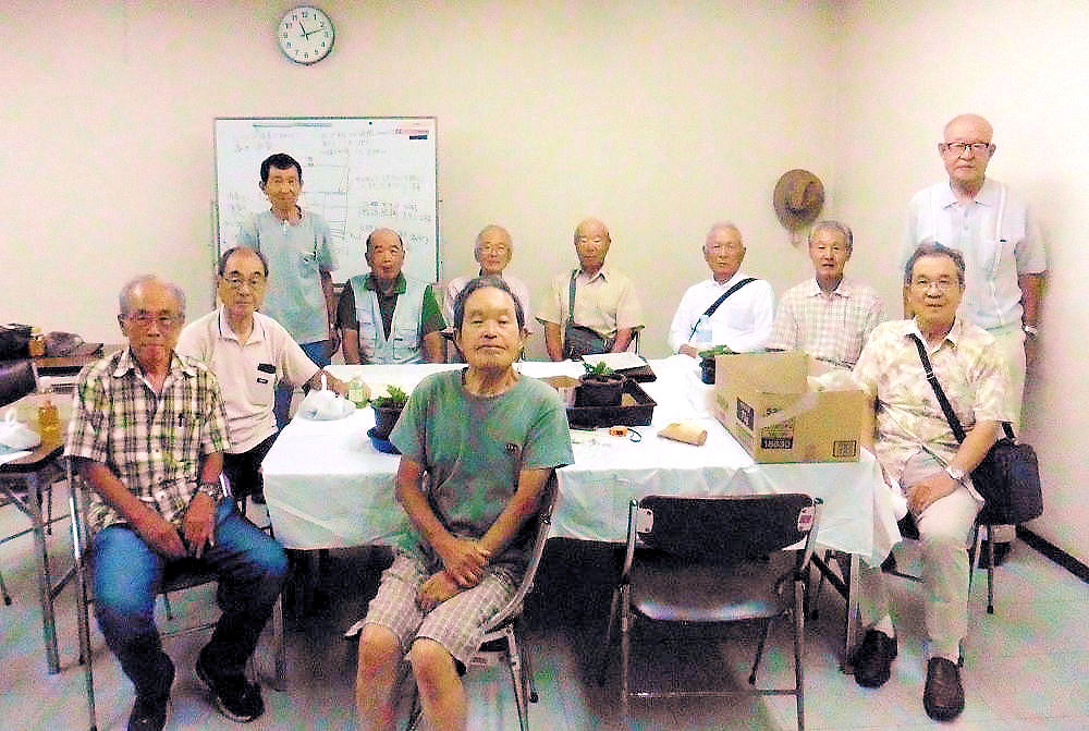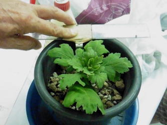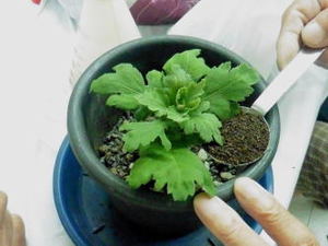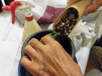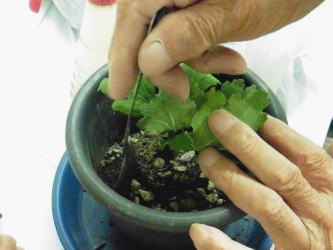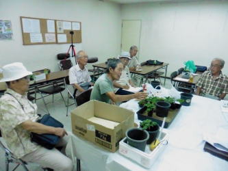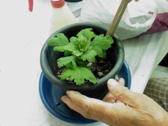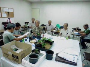 2) ポット上げした福助の5号鉢への定植; 定植の時期は1週間先になるので、柳川講師提供のポット上げした福助の苗を使い、5号鉢への定植手法の説明を実技を伴い,柳川氏から説明を受けた。講師以外には、3人のメンバーの方が実習した。