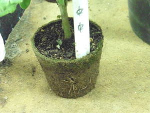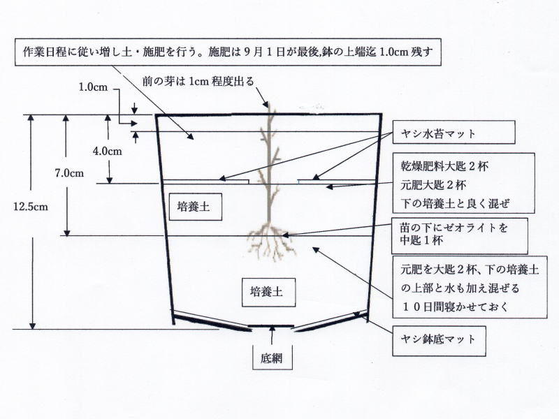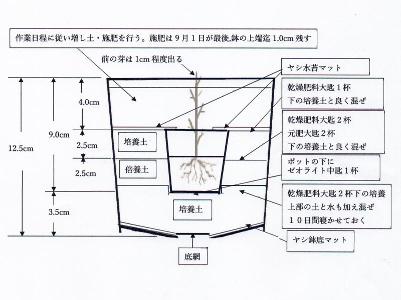 基本的な手順はテキストに準じるが、ポット上げの寸法が1cm長くなり、施肥をたっぷりにするなど、多少の修正がなされた手順になった。その定植した状態の構造図を下にしめす。