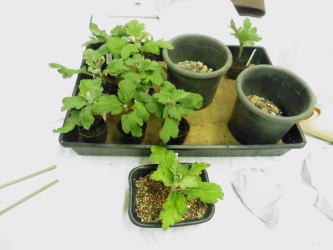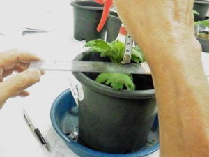前回の説明は、「水遣りは、ポットの側面が乾き、苗の頂部の葉がシンナリしそうになった時点で、噴霧器を使って培養土の上面に注水する。ポットの側面が濡れて来る程度行う。」としているが、第6回勉強会時点の日照は余りに強く、培養土上面の乾き具合をみて、噴霧器で十分に水を与える必要がある。日照と雨の具合を見て、調整が必要。この頃の日照りでは直接日に曝すのでなく、日照が50%位の寒冷紗で覆うのが良い。