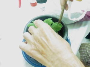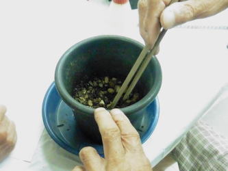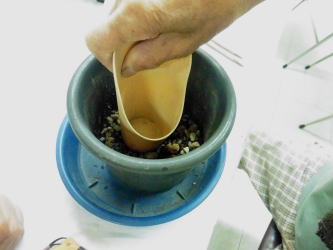 08.ポットの中間部まで、培養土を加える 09.乾燥肥料大匙2杯加え箸の先端で良く突く